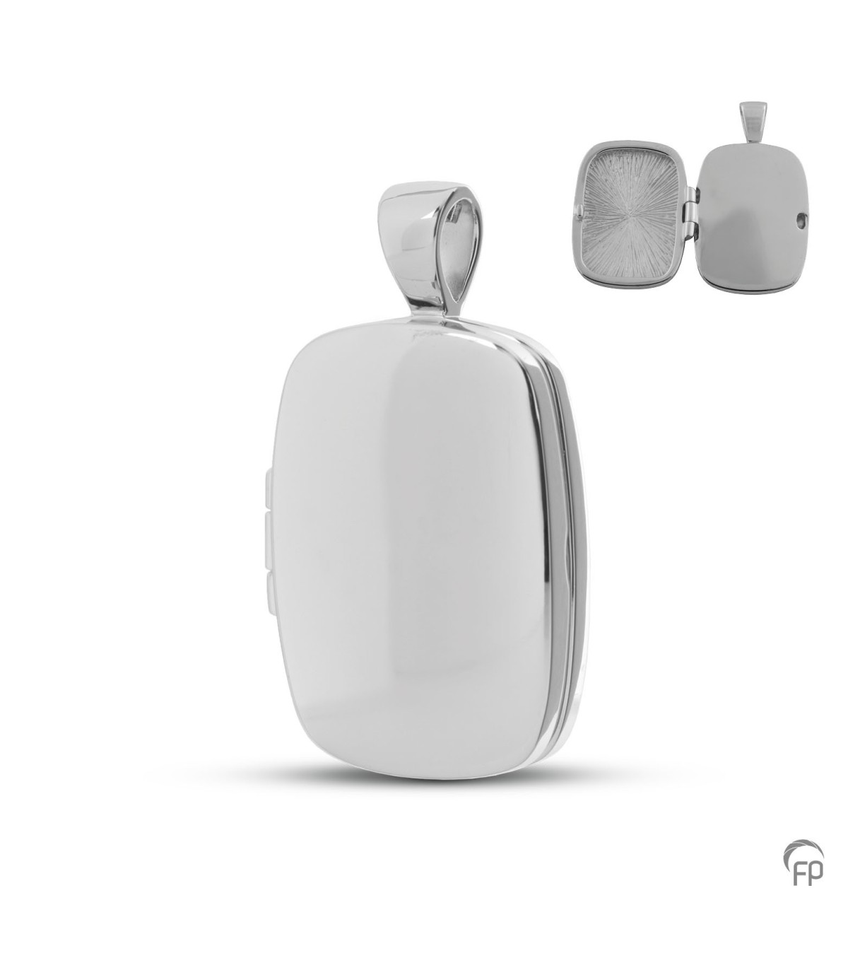 Glanzende 925 Sterling zilveren medaillon. Bevat ruimte voor een foto met daarnaast een holle ruimte voor een symbolische hoeveelheid as.