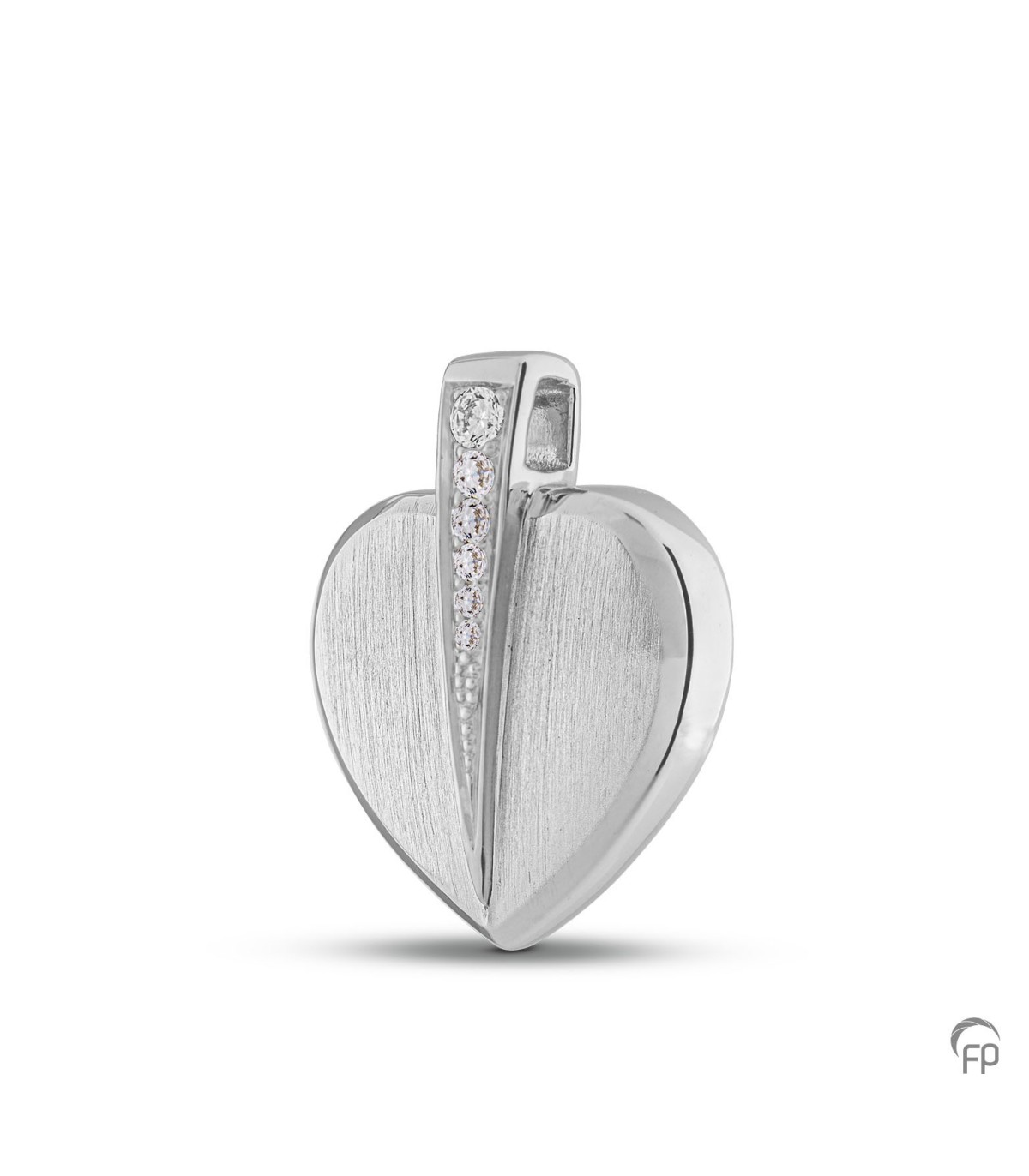 Gematteerde 925 Sterling zilveren ashanger met zirkonia steentjes en glanzende randen. Bevat een holle ruimte voor een symbolische hoeveelheid as.