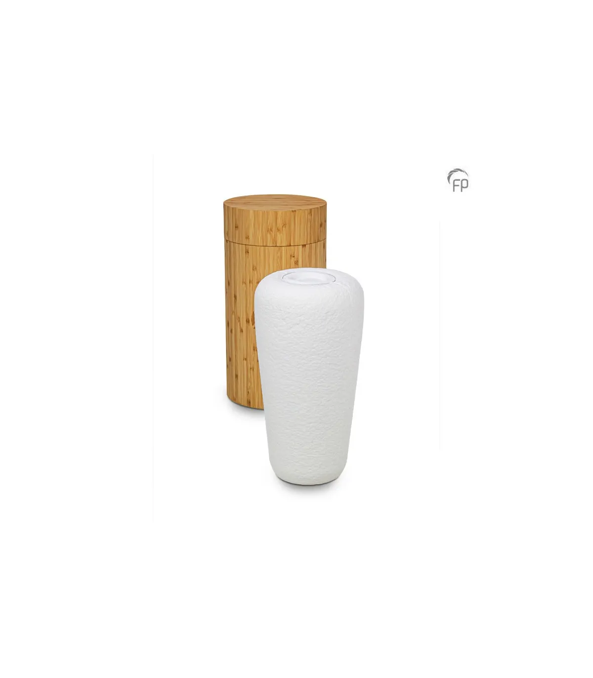 De urn wordt geleverd met een handgemaakte, milieuvriendelijke bamboe houder, die als beschermhoes dient tijdens het vervoeren.