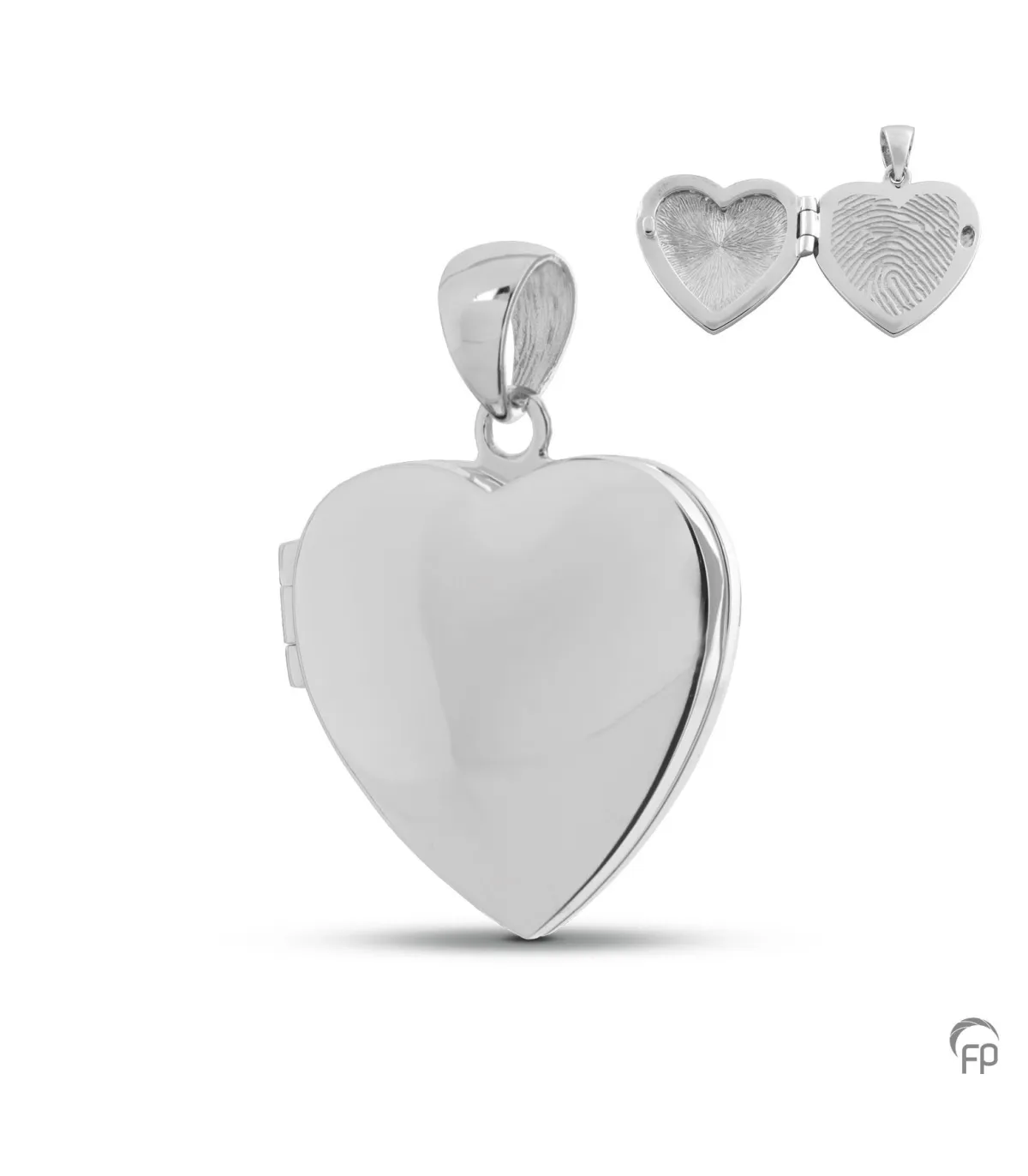 Glanzende 925 Sterling zilveren medaillon met vingerprint. Bevat ruimte voor een foto met daarbij een holle ruimte voor een symbolische hoeveelheid as.
