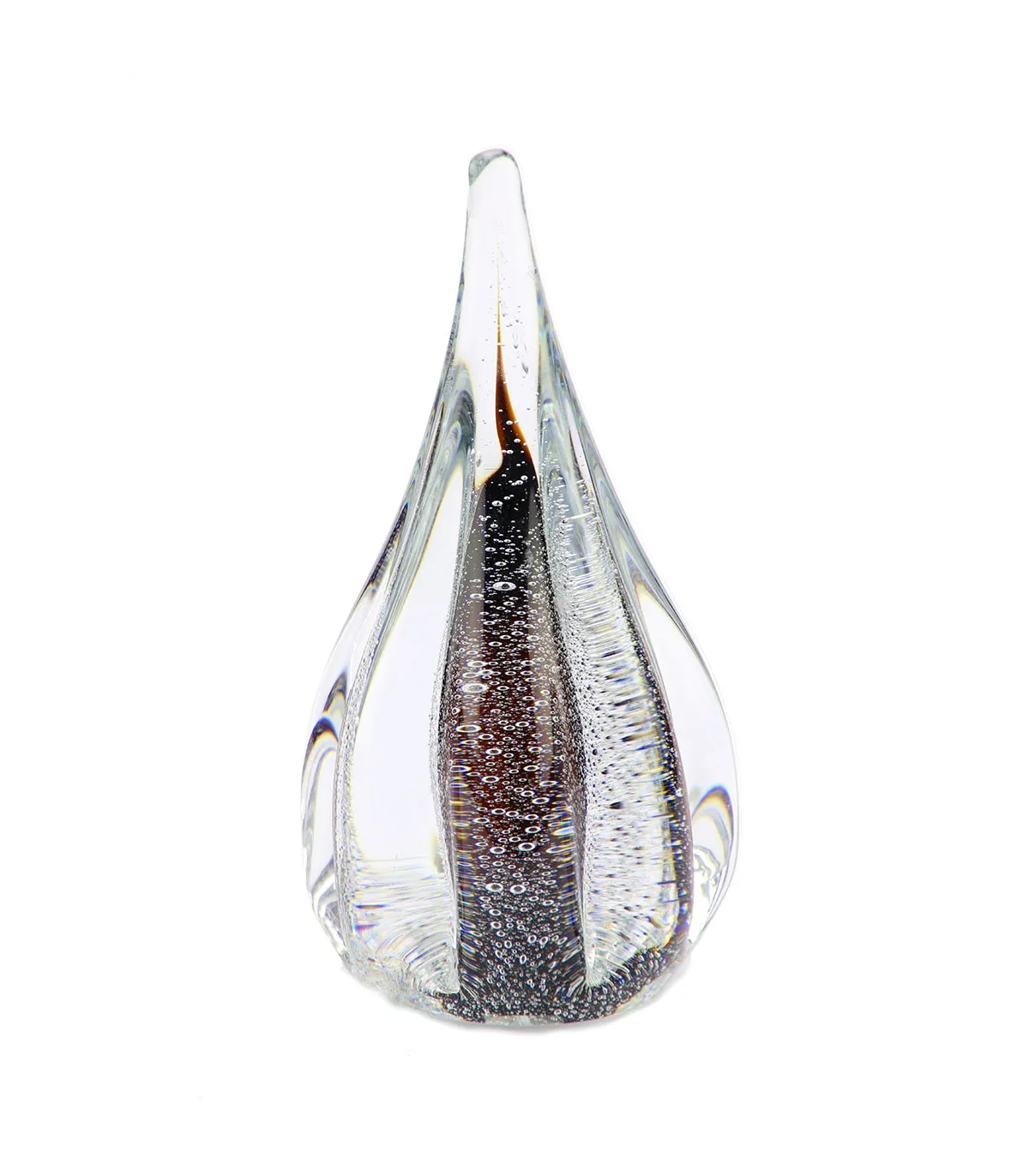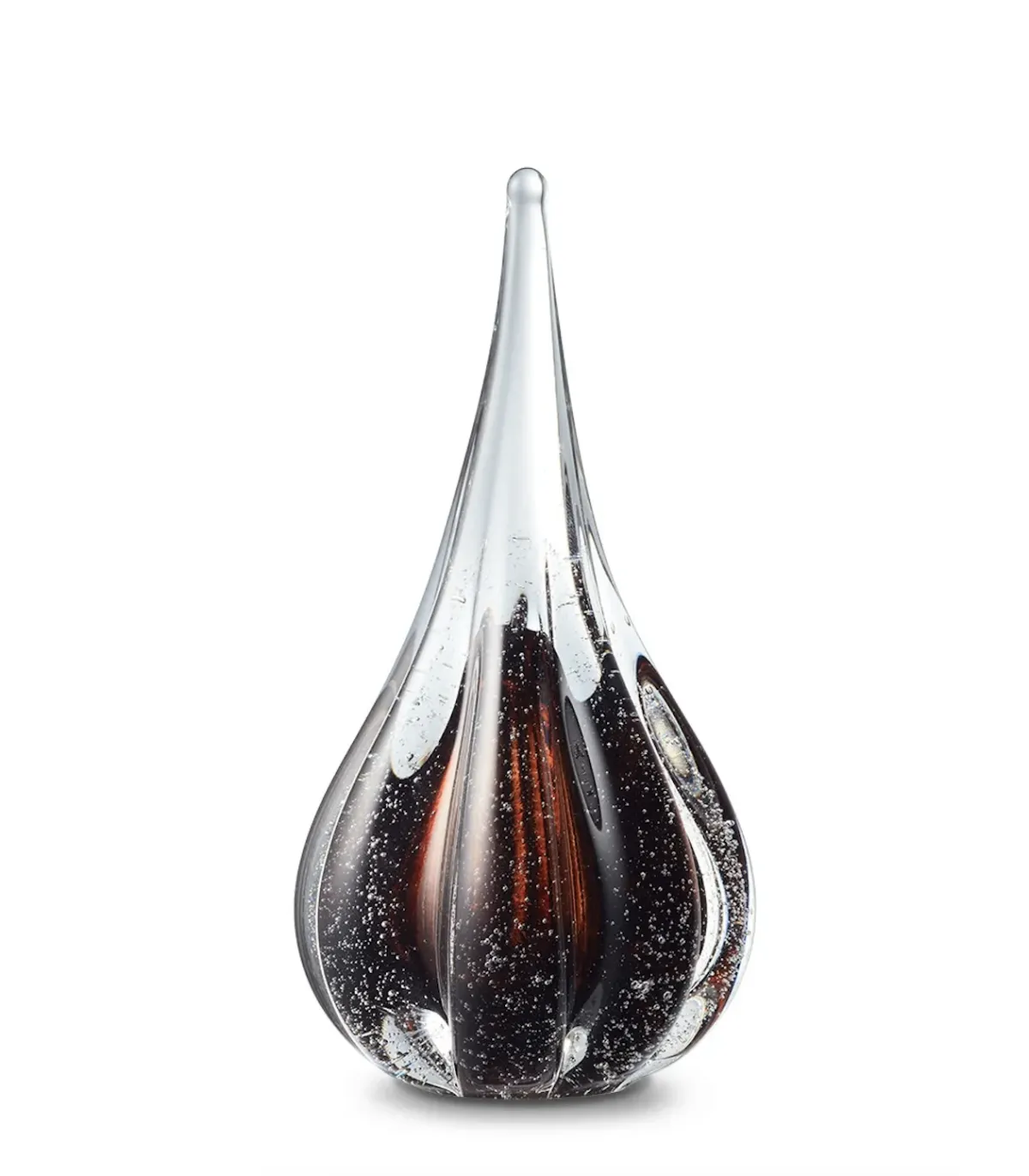 Deze mooie kristalglazen urn heeft de vorm van een sierlijke druppel met een krachtige cognackleurige kern. Aan de buitenzijde bevinden zich speelse reliëfstroken. Ook bevat de urn minuscule luchtbelletjes die het ornament laten sprankelen. In de kern bevindt zich een holle ruimte waar een gedeelte van het as in bewaard kan worden. Dit as-reservoir wordt door middel van een zelf-hechtende sluitplaat afgesloten.
