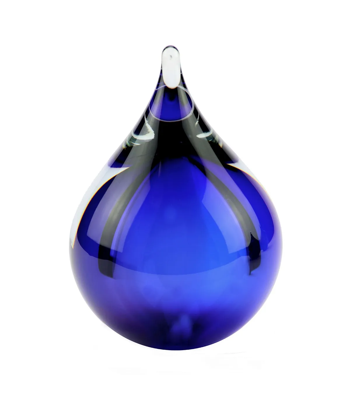 Deze mooie kristalglazen urn heeft een ronde druppel vorm met een krachtige blauwe kern. In de kern bevindt zich een holle ruimte waar een gedeelte van het as in bewaard kan worden. Dit as-reservoir wordt door middel van een zelf-hechtende sluitplaat afgesloten.