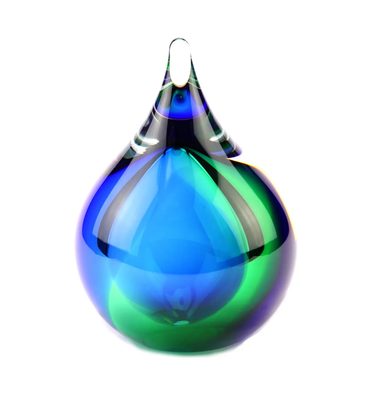 Deze mooie kristalglazen urn heeft een ronde druppel vorm met een krachtige blauw met groene kern. In de kern bevindt zich een holle ruimte waar een gedeelte van het as in bewaard kan worden. Dit as-reservoir wordt door middel van een zelf-hechtende sluitplaat afgesloten.