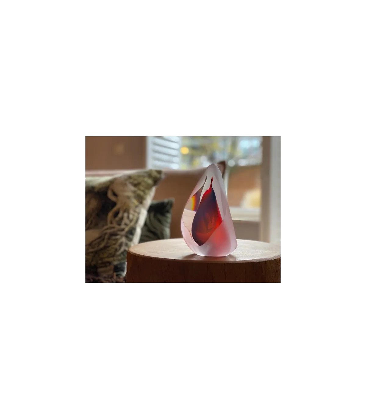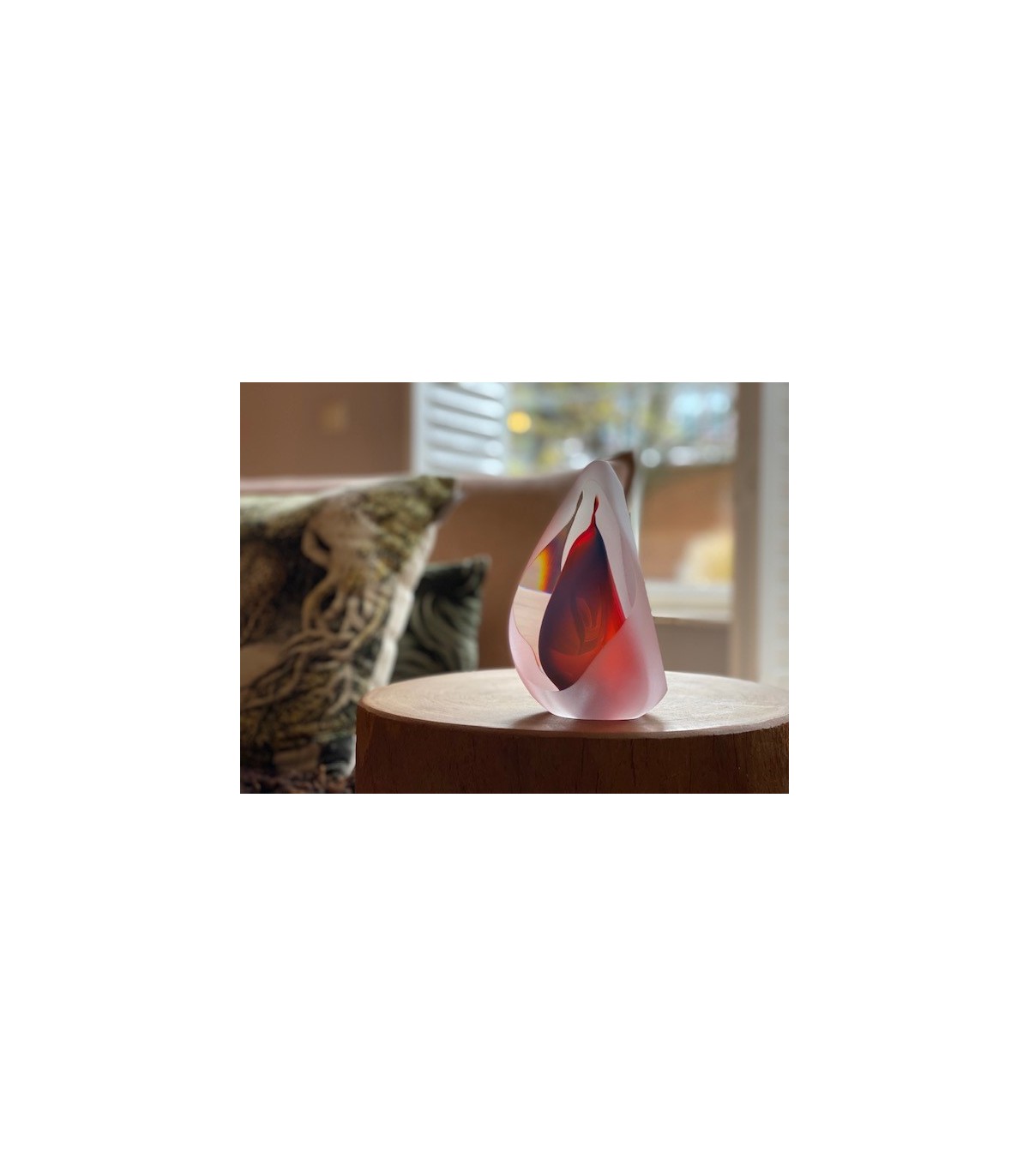 Deze mooie kristalglazen urn heeft een krachtige rode kern die van alle kanten wordt gereflecteerd. In de kern bevindt zich een holle ruimte waar een gedeelte van het as in bewaard kan worden. Dit as-reservoir wordt door middel van een zelf-hechtende sluitplaat afgesloten.