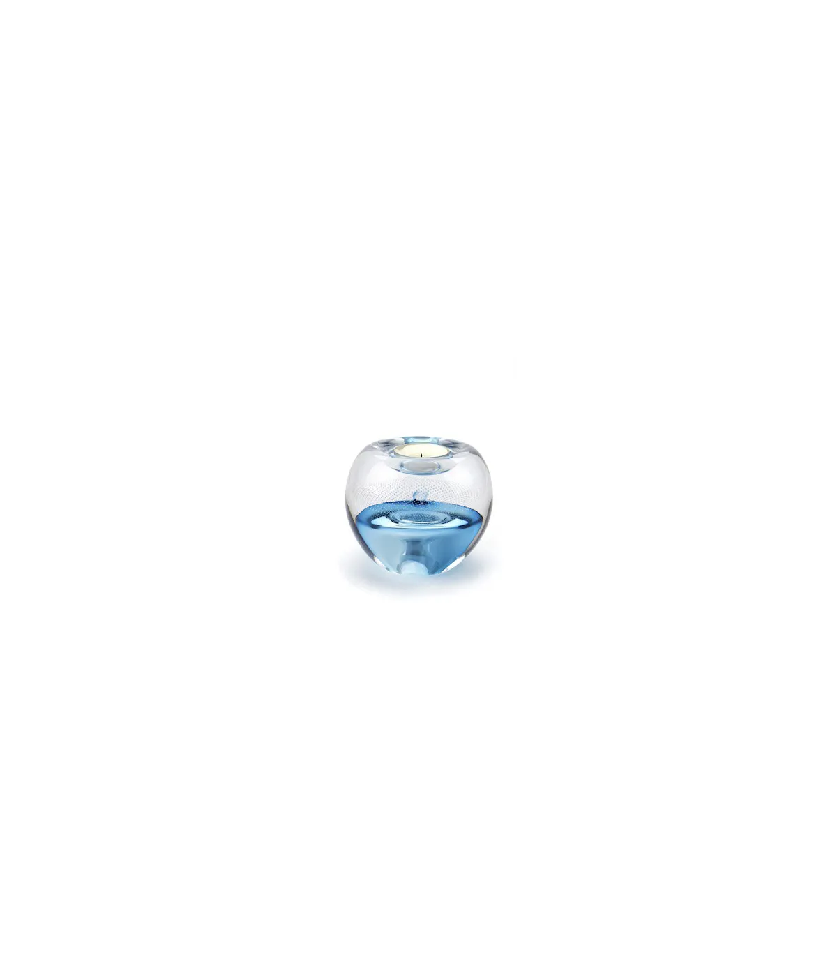 Deze mooie kristalglazen kaarsenhouder heeft een krachtige Tiffany-blauwe kern met een sluier van sprankelende minuscule bubbeltjes. In de kern bevindt zich een holle ruimte waar een gedeelte van het as in bewaard kan worden. Dit as-reservoir wordt door middel van een zelf-hechtende sluitplaat afgesloten.