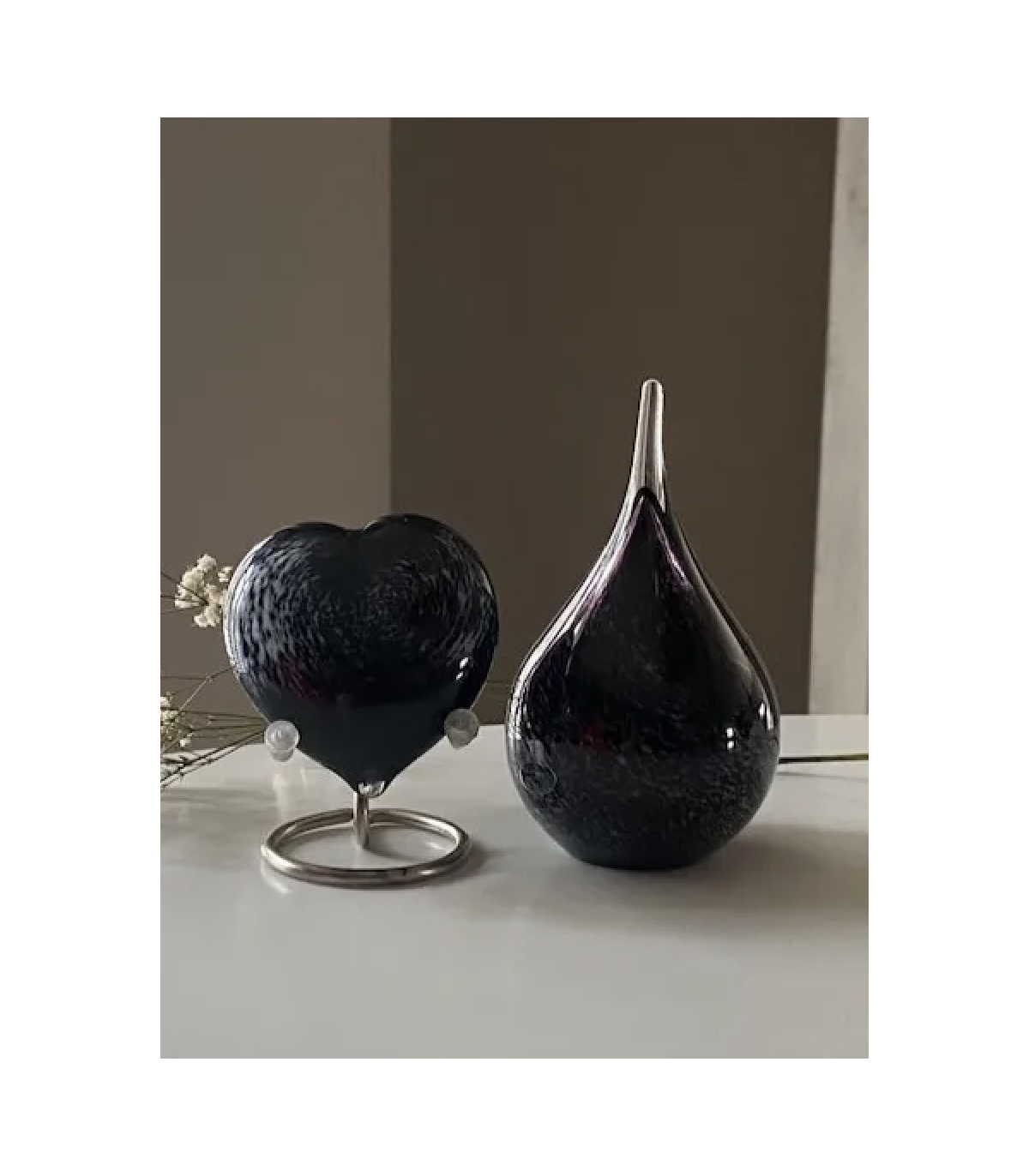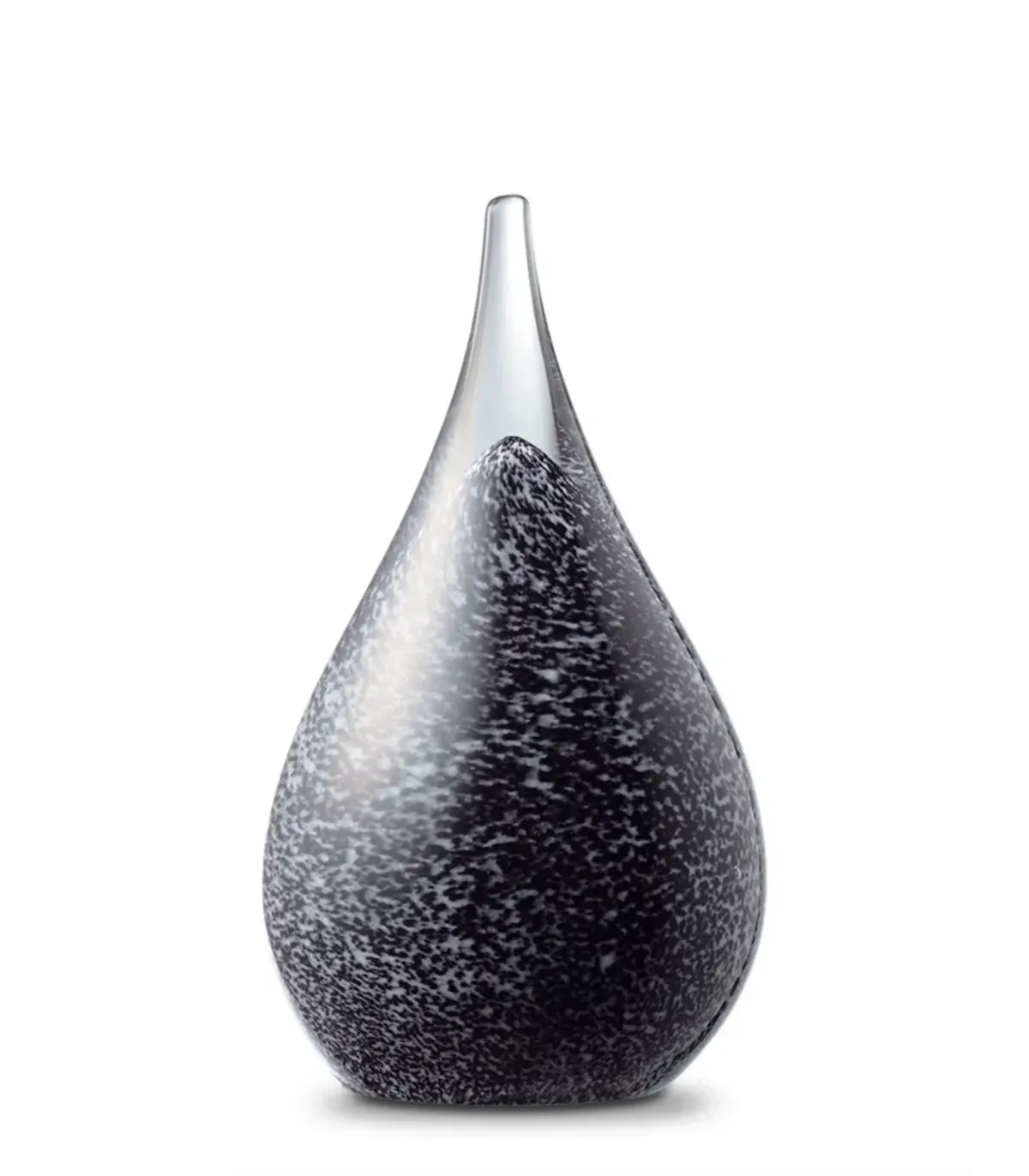 Deze mooie kristalglazen urn heeft de vorm van een sierlijke druppel met een zwart-witte kleur. In de kern bevindt zich een holle ruimte waar een gedeelte van het as in bewaard kan worden. Dit as-reservoir wordt door middel van een zelf-hechtende sluitplaat afgesloten.