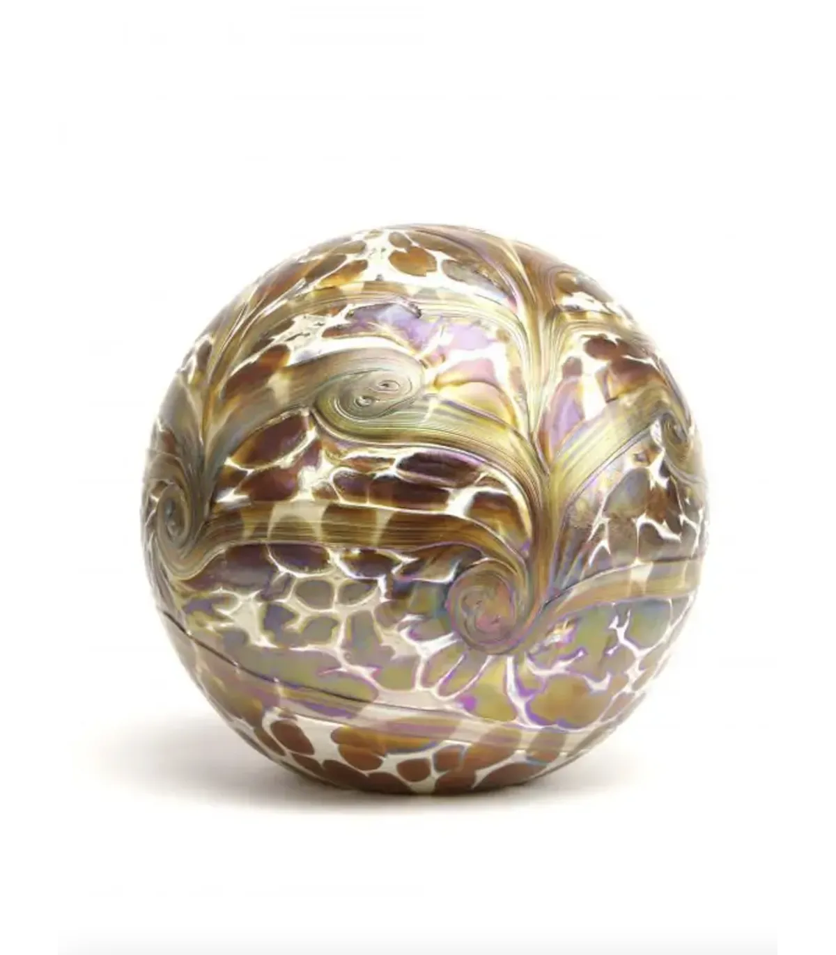 Deze mooie bolvormige kristalglazen urn behoord tot de Elan-line die geïnspireerd is op de 4 natuur elementen: water, aarde, vuur en lucht. De urn heeft een kleurencombinatie van goudtinten met een lichte parelmoerglans en fijn reliëf. In de kern bevindt zich een holle ruimte waar het as in bewaard kan worden. Dit as-reservoir wordt door middel van een zelf-hechtende sluitplaat afgesloten.