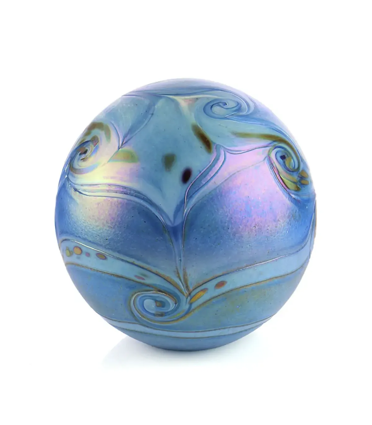 Deze mooie bolvormige kristalglazen urn behoord tot de Elan-line die geïnspireerd is op de 4 natuur elementen: water, aarde, vuur en lucht. De urn heeft een kleurencombinatie van blauw met lichte parelmoerglans en fijn reliëf. In de kern bevindt zich een holle ruimte waar het as in bewaard kan worden. Dit as-reservoir wordt door middel van een zelf-hechtende sluitplaat afgesloten.