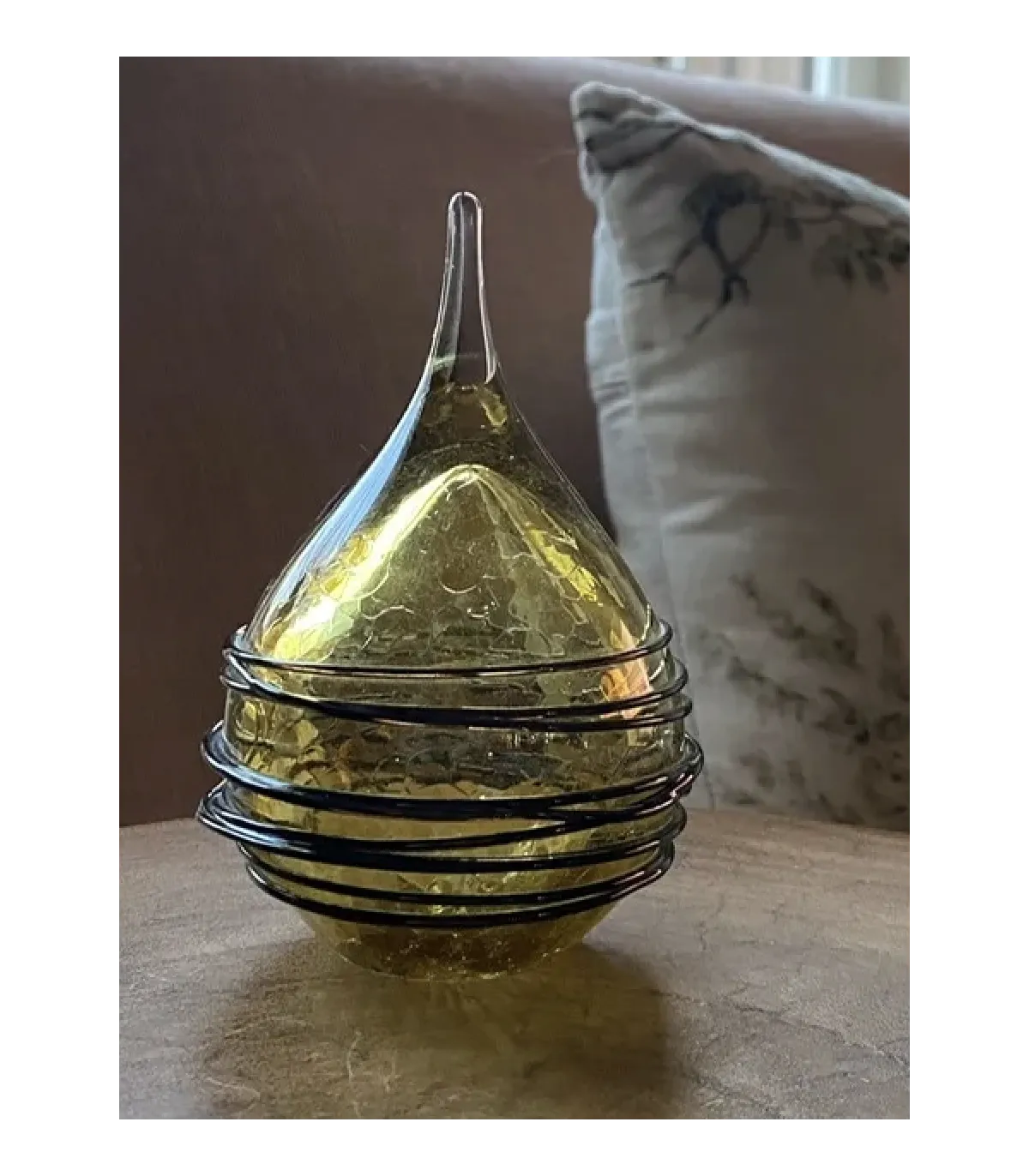 Deze mooie kristalglazen urn heeft de vorm van een sierlijke druppel met een transparante goudkleurige kern. In de kern bevindt zich een holle ruimte waar een gedeelte van het as in bewaard kan worden. Dit as-reservoir wordt door middel van een zelf-hechtende sluitplaat afgesloten.