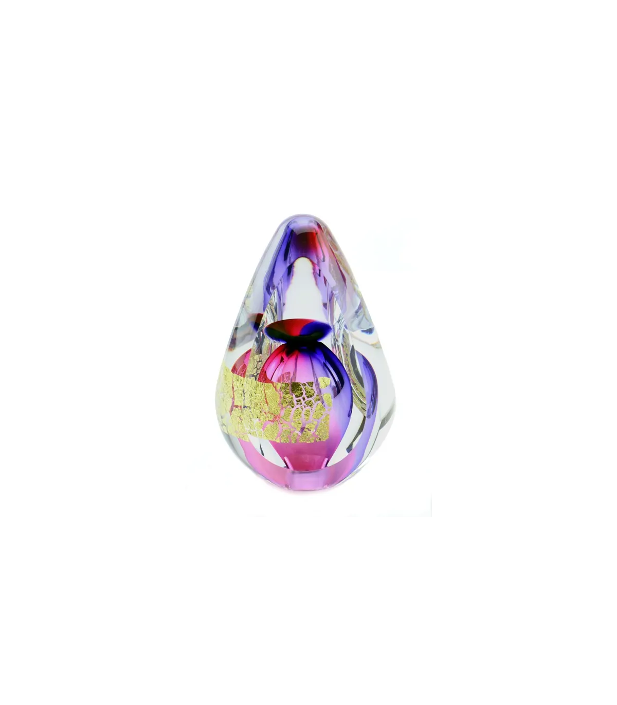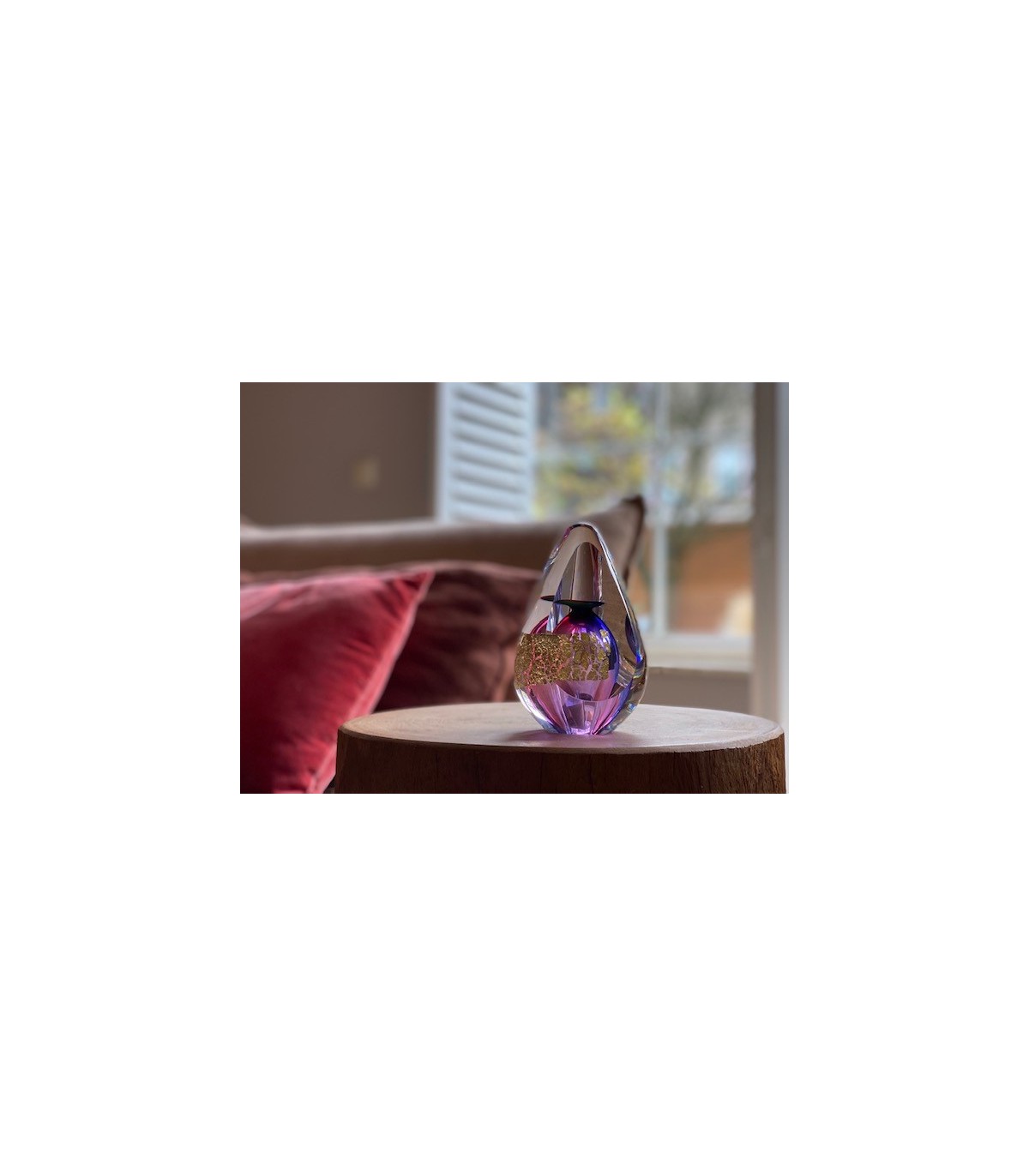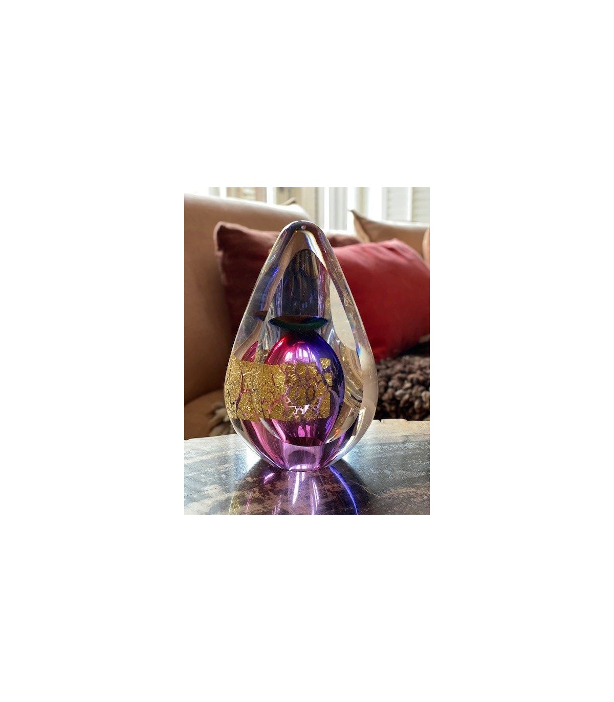 Deze mooie kristalglazen urn heeft een krachtige paars/roze/blauwe kern met een detail van echt bladgoud. In de kern bevindt zich een holle ruimte waar een gedeelte van het as in bewaard kan worden. Dit as-reservoir wordt door middel van een zelf-hechtende sluitplaat afgesloten.