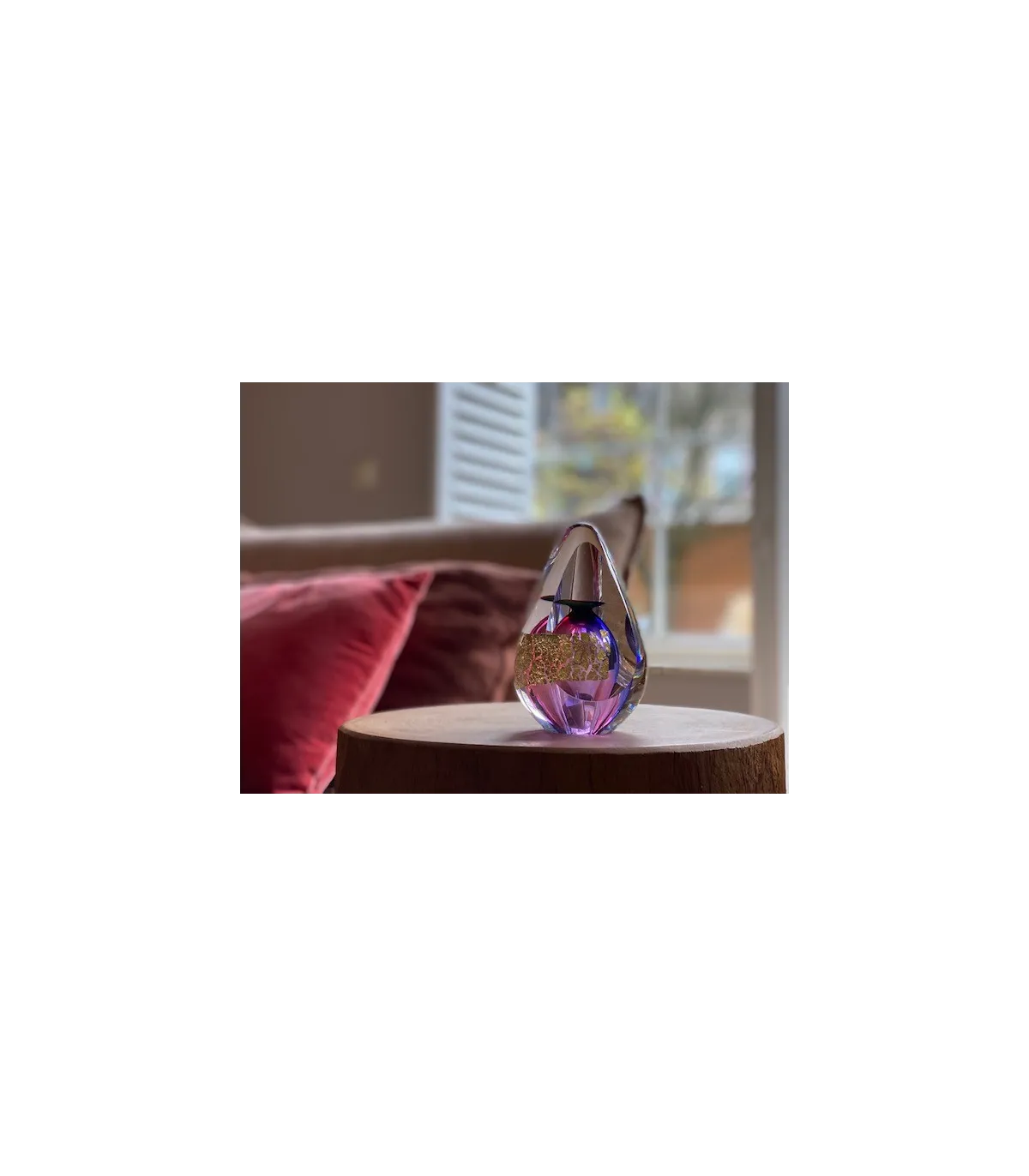 Elke urn is uniek getekend en geheel met de hand vervaardigd uit kristalglas.