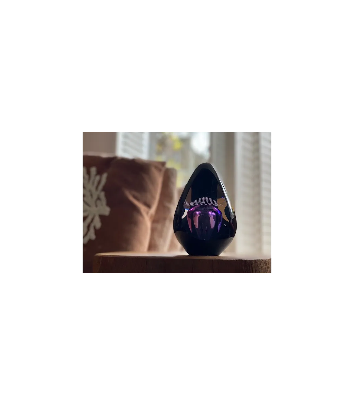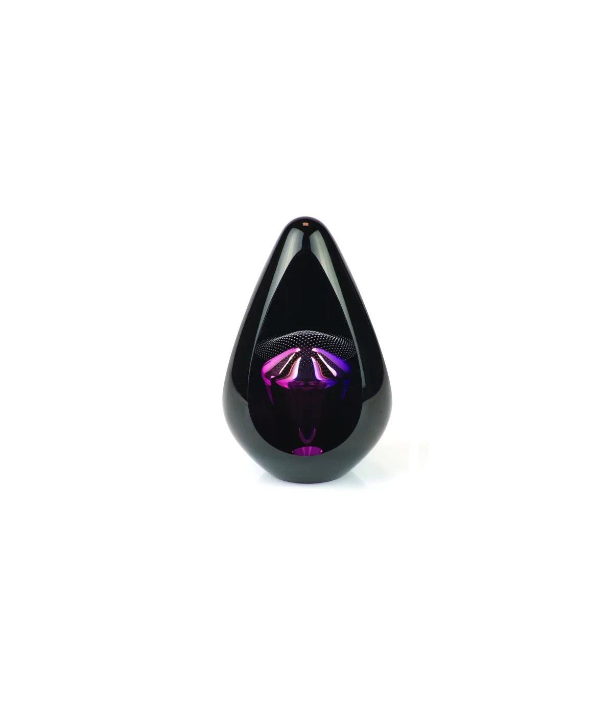 Deze mooie kristalglazen urn heeft een krachtige paarse kern met een sluier van sprankelende minuscule bubbeltjes. De buitenzijde van de urn heeft een zwart glanzende afwerking. In de kern bevindt zich een holle ruimte waar een gedeelte van het as in bewaard kan worden. Dit as-reservoir wordt door middel van een zelf-hechtende sluitplaat afgesloten.