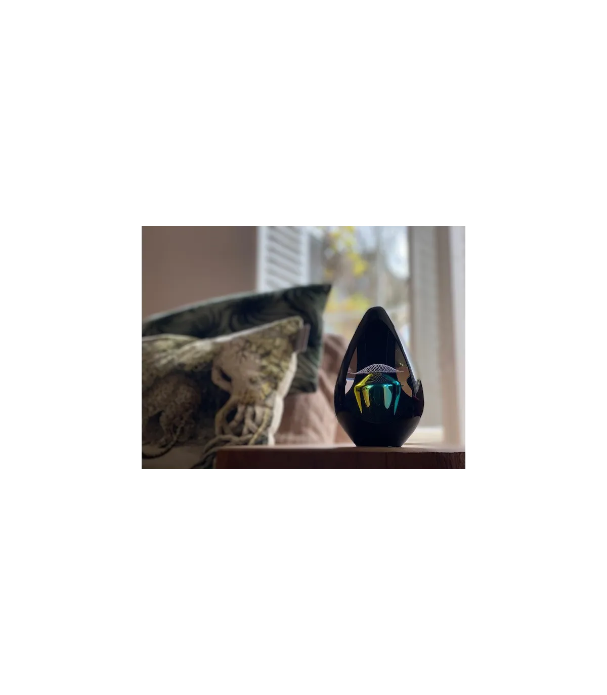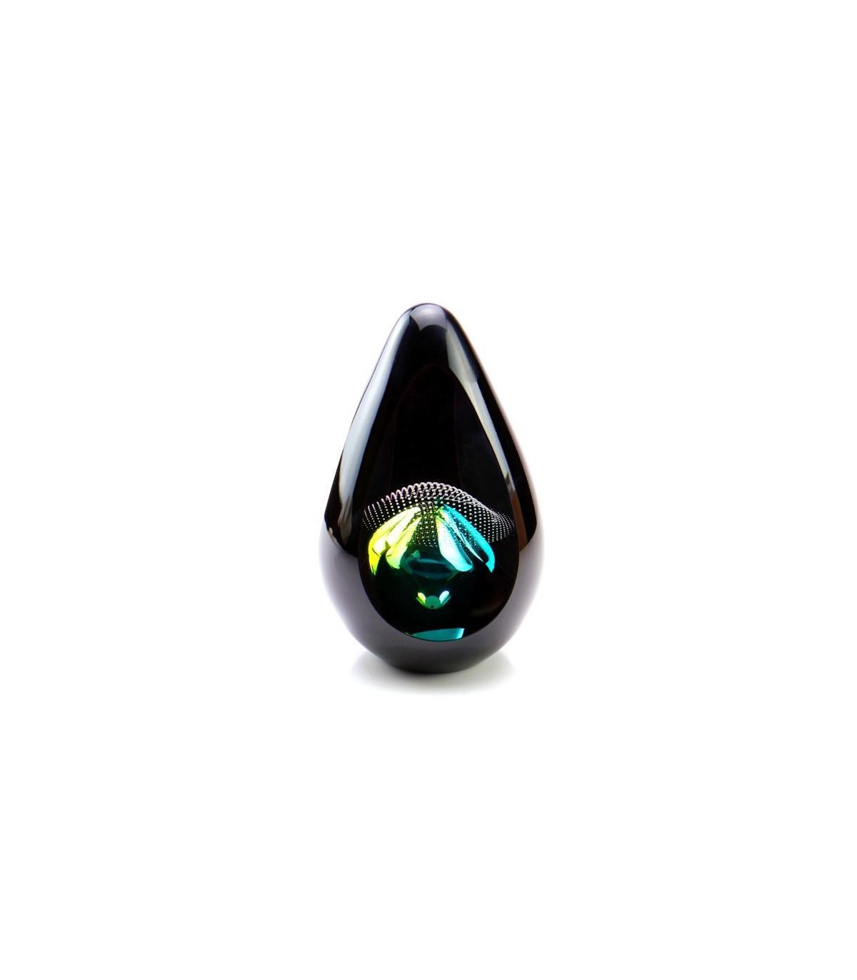 Deze mooie kristalglazen urn heeft een krachtige geel/groene kern met een sluier van sprankelende minuscule bubbeltjes. De buitenzijde van de urn heeft een zwart glanzende afwerking. In de kern bevindt zich een holle ruimte waar een gedeelte van het as in bewaard kan worden. Dit as-reservoir wordt door middel van een zelf-hechtende sluitplaat afgesloten.