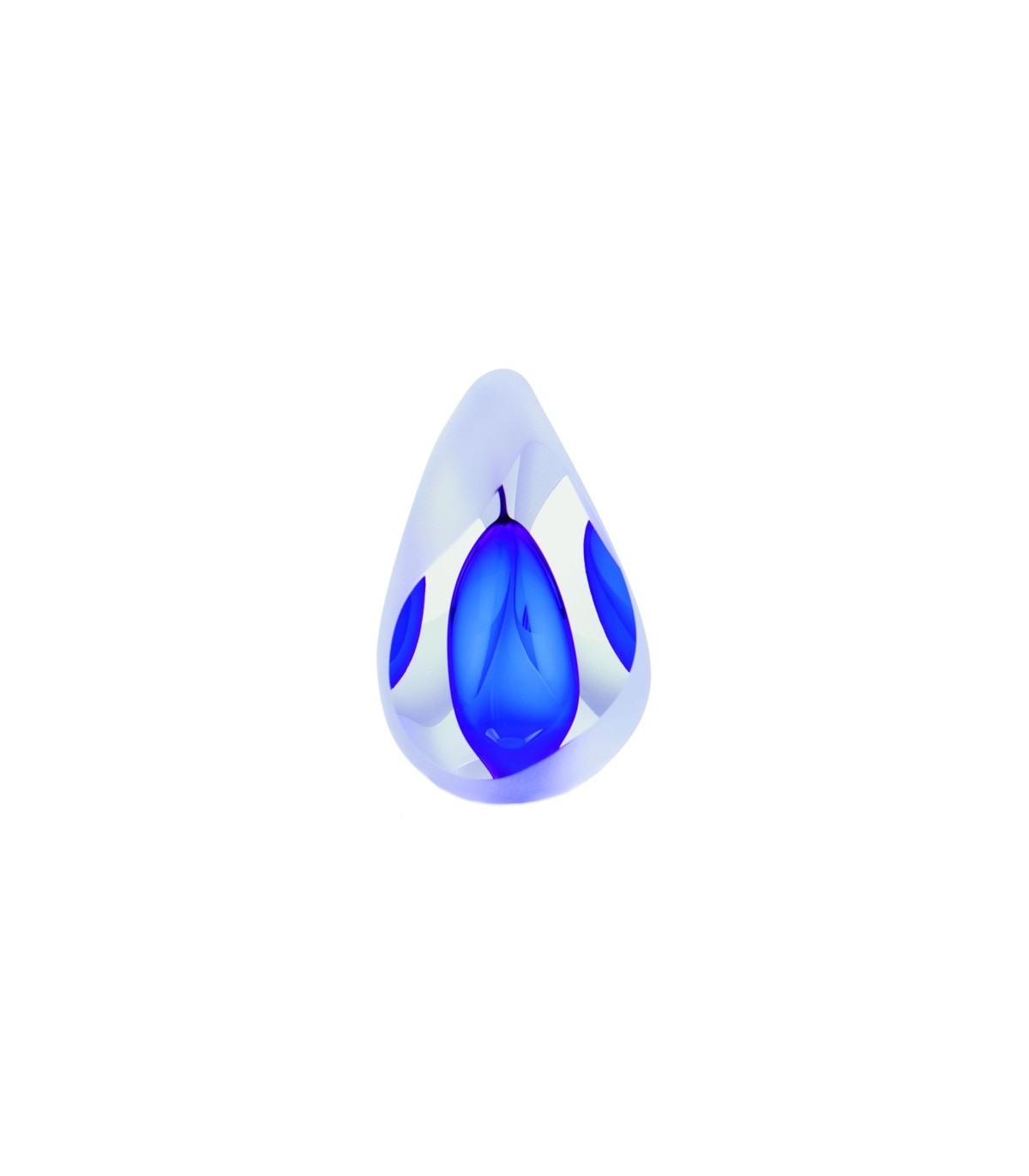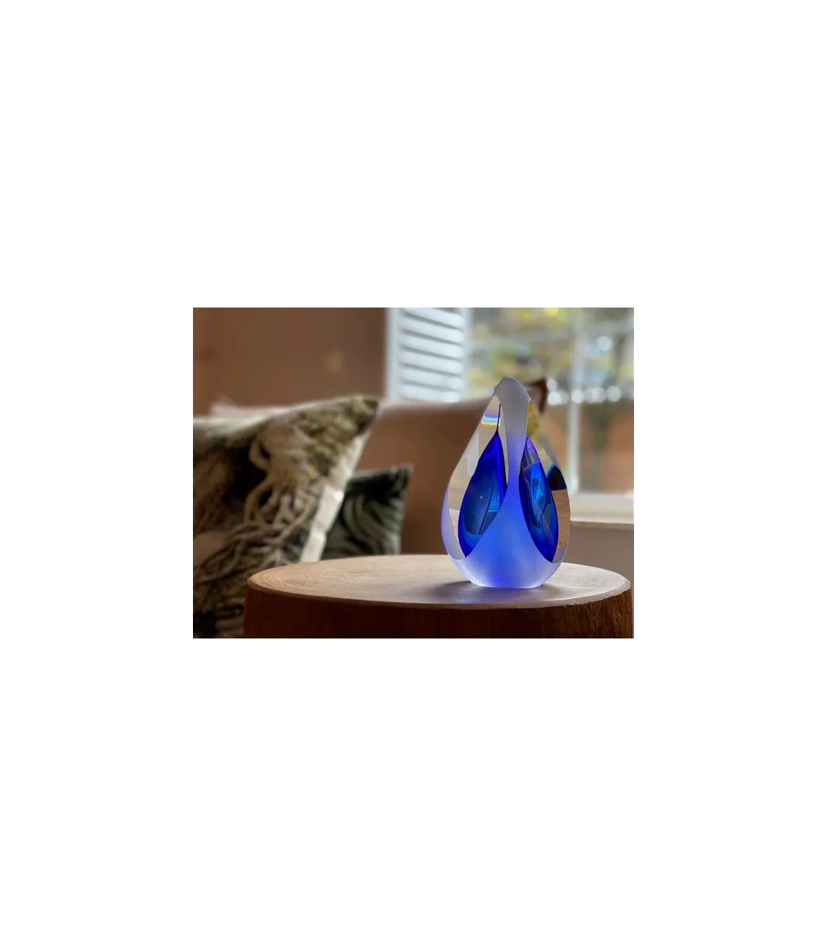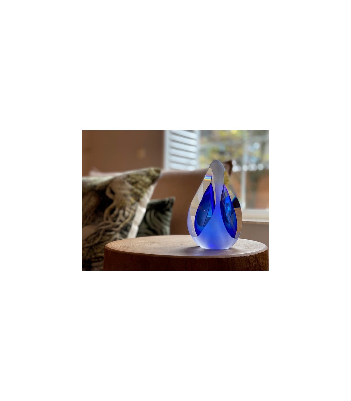 Deze mooie kristalglazen urn heeft een krachtige blauwe kern die van alle kanten wordt gereflecteerd. In de kern bevindt zich een holle ruimte waar een gedeelte van het as in bewaard kan worden. Dit as-reservoir wordt door middel van een zelf-hechtende sluitplaat afgesloten.