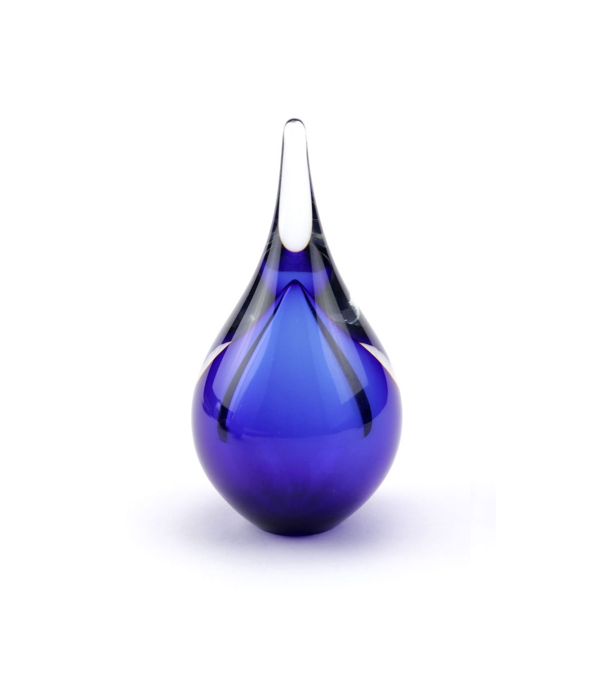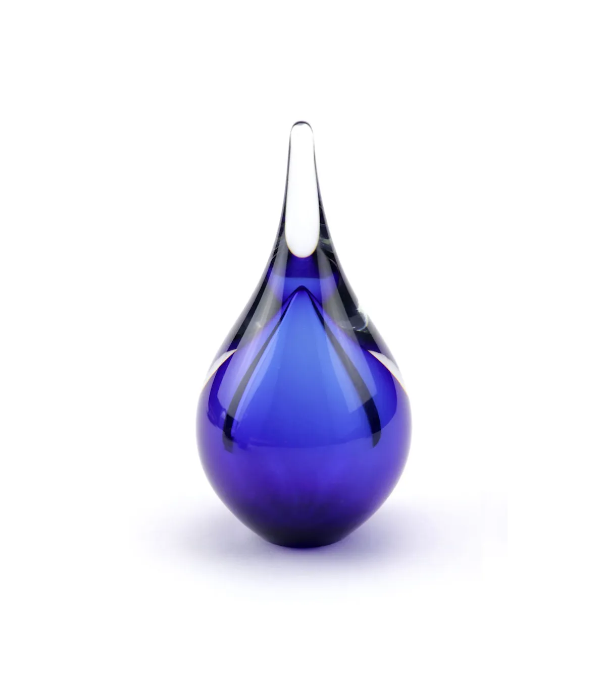 Deze mooie kristalglazen urn heeft de vorm van een sierlijke druppel met een krachtige blauwe kern. In de kern bevindt zich een holle ruimte waar een gedeelte van het as in bewaard kan worden. Dit as-reservoir wordt door middel van een zelf-hechtende sluitplaat afgesloten.