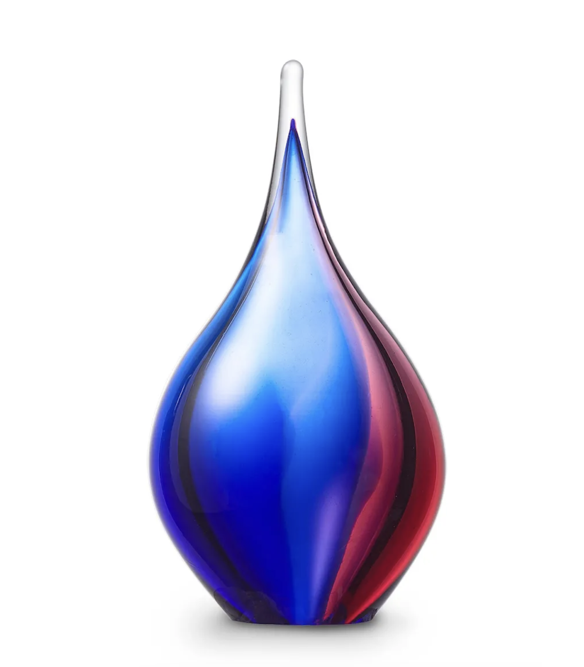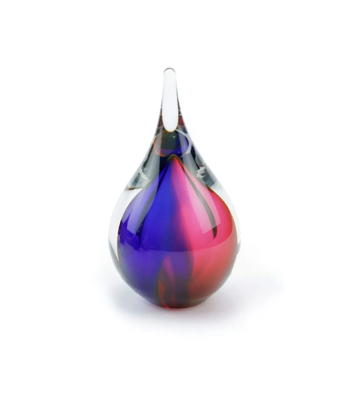 Deze mooie kristalglazen urn heeft de vorm van een sierlijke druppel met een krachtige roze met blauwe kern. In de kern bevindt zich een holle ruimte waar een gedeelte van het as in bewaard kan worden. Dit as-reservoir wordt door middel van een zelf-hechtende sluitplaat afgesloten.
