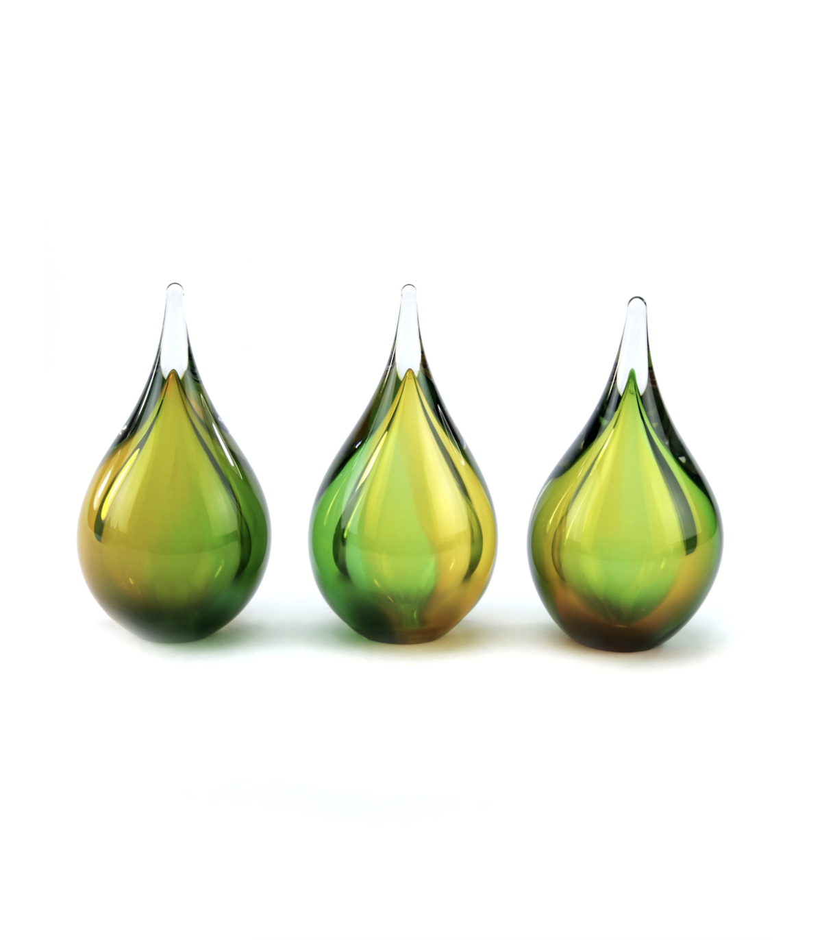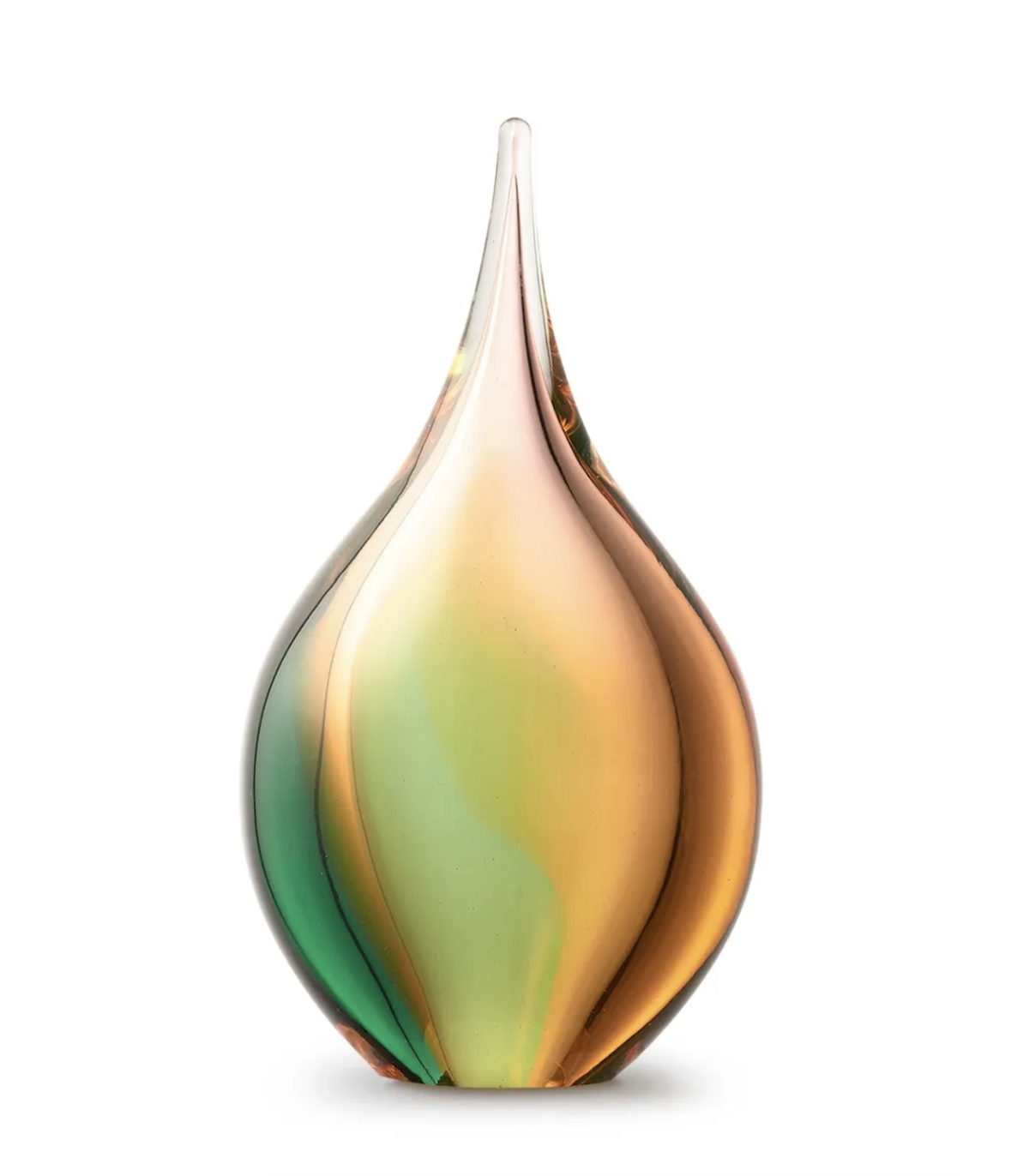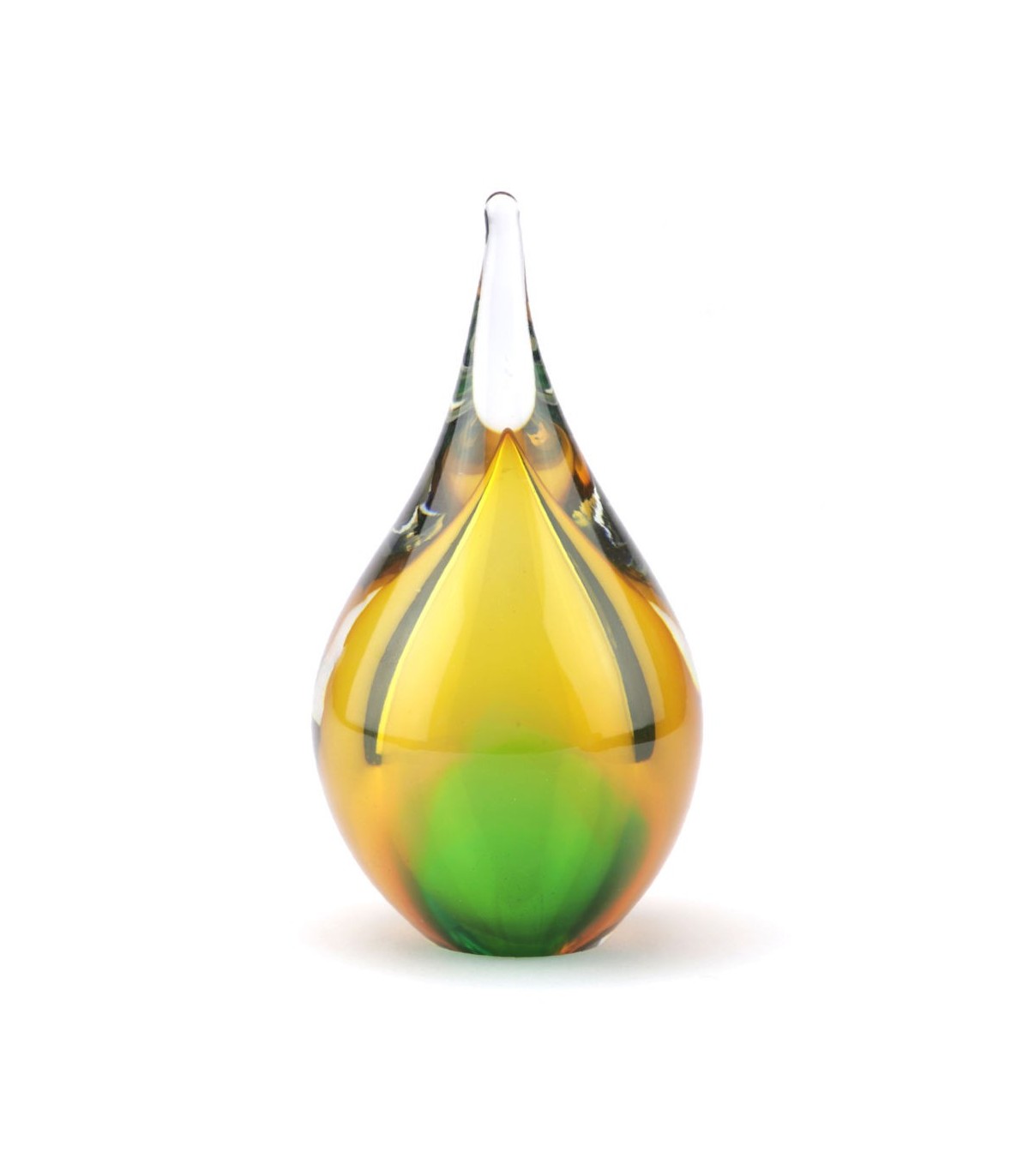 Deze mooie kristalglazen urn heeft de vorm van een sierlijke druppel met een krachtige goud met groene kern. In de kern bevindt zich een holle ruimte waar een gedeelte van het as in bewaard kan worden. Dit as-reservoir wordt door middel van een zelf-hechtende sluitplaat afgesloten.