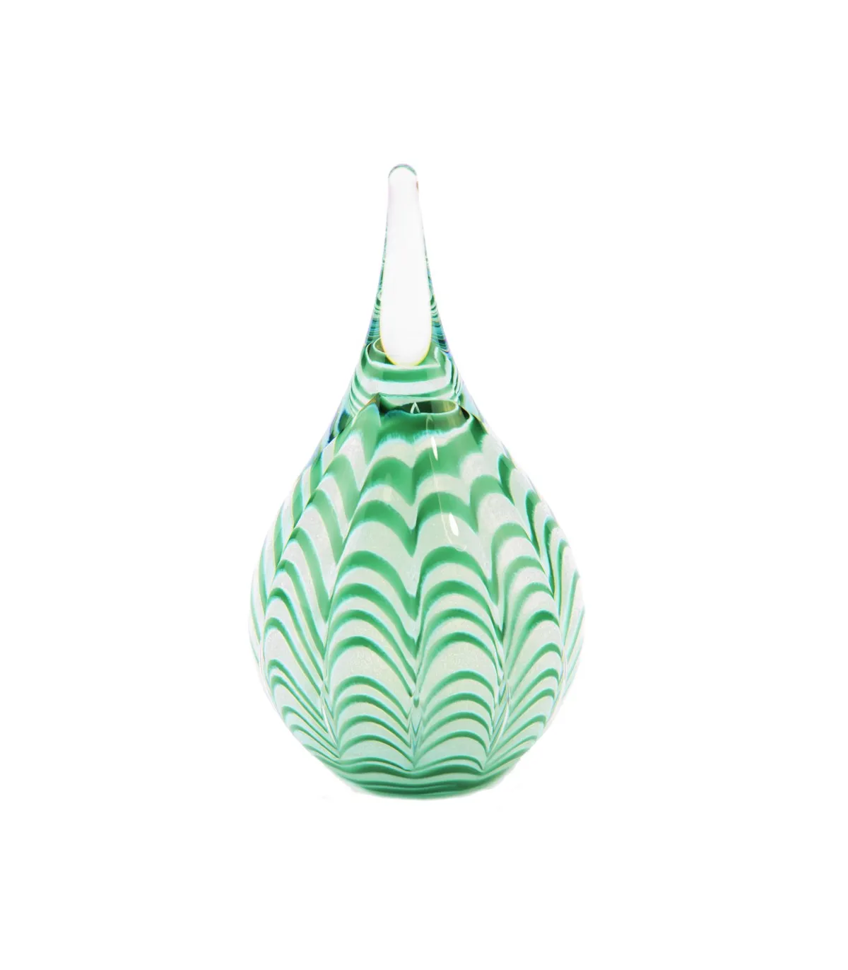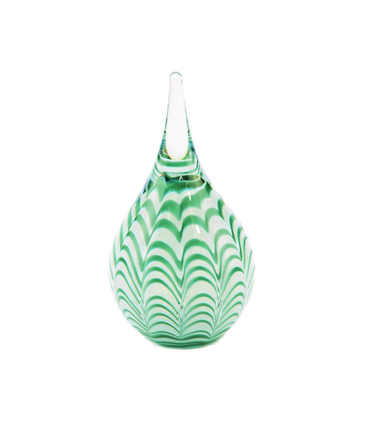 Deze mooie kristalglazen urn heeft de vorm van een sierlijke druppel met een golvend wit met groen patroon. In de kern bevindt zich een holle ruimte waar een gedeelte van het as in bewaard kan worden. Dit as-reservoir wordt door middel van een zelf-hechtende sluitplaat afgesloten.