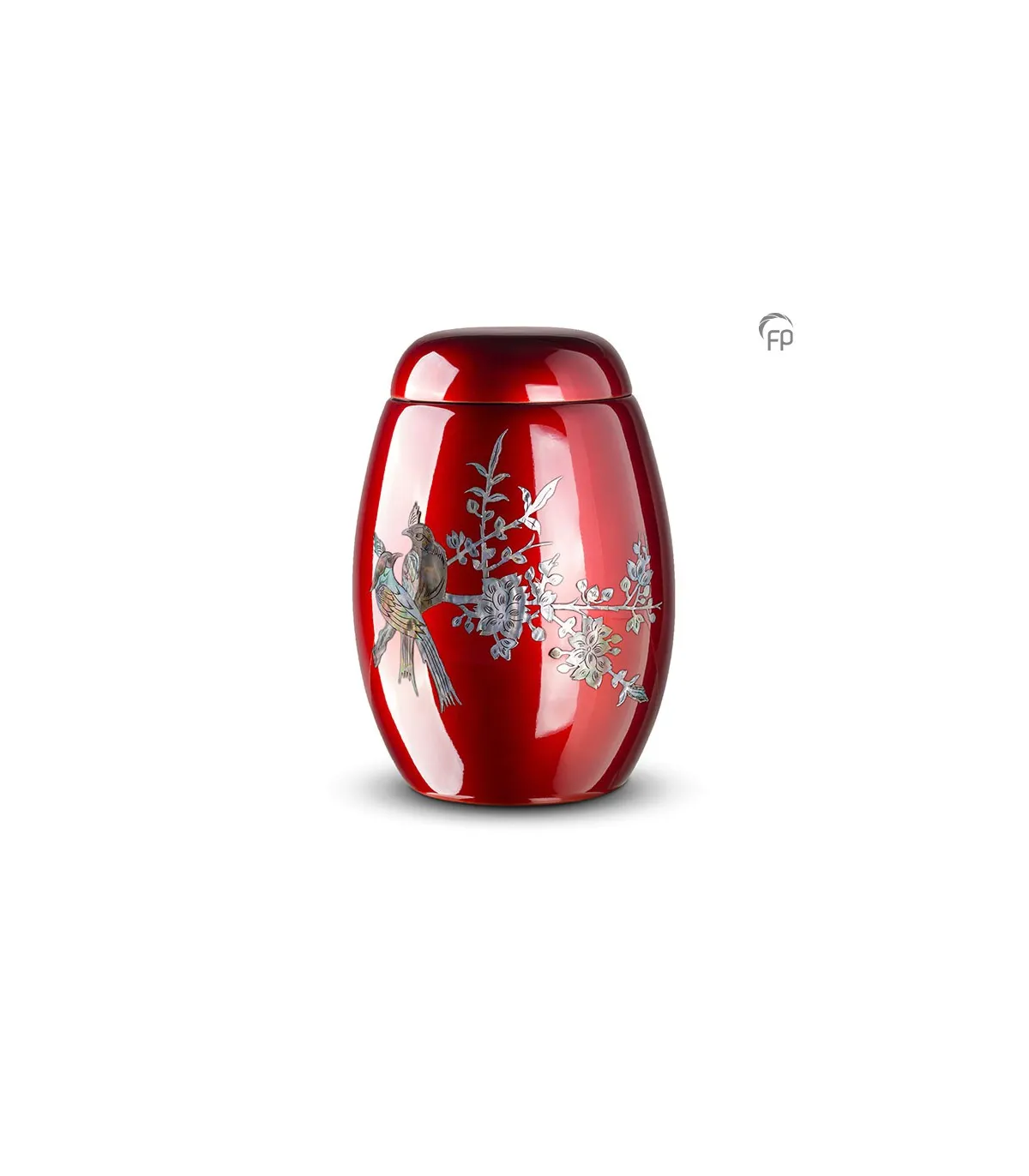 Deze urn is volledig met de hand gemaakt van ultralicht glasfiber, met mooie vogels van parelmoer.