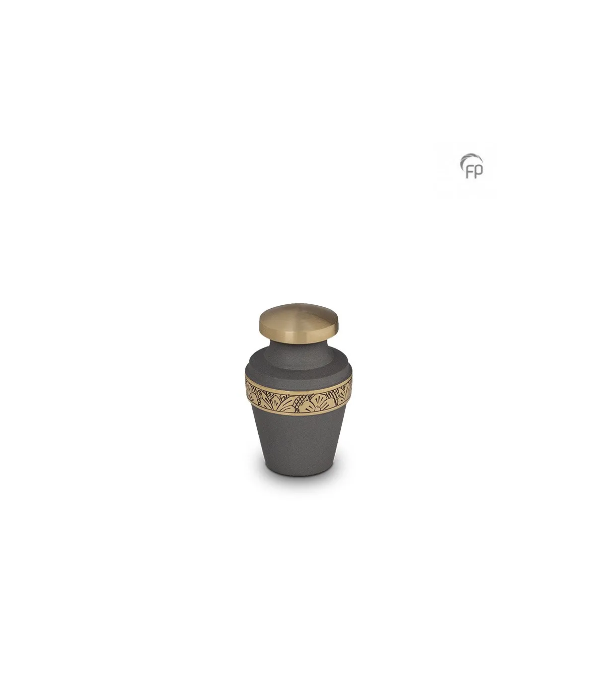 Deze grote urn is geheel met de hand vervaardigd uit hoogwaardige materialen als messing en aluminium. De urn is voorzien van een sierlijke goudkleurige band en deksel.