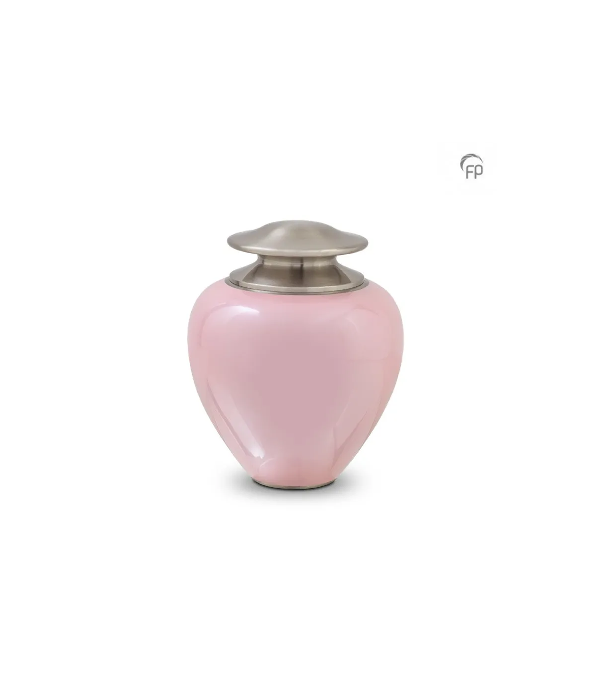 Deze grote metalen urn is geheel met de hand vervaardigd uit hoogwaardige materialen, zoals messing en aluminium. De urn heeft een stijlvolle uitstraling door de mooie zilverkleurige accenten en de roze parelmoer finishing.