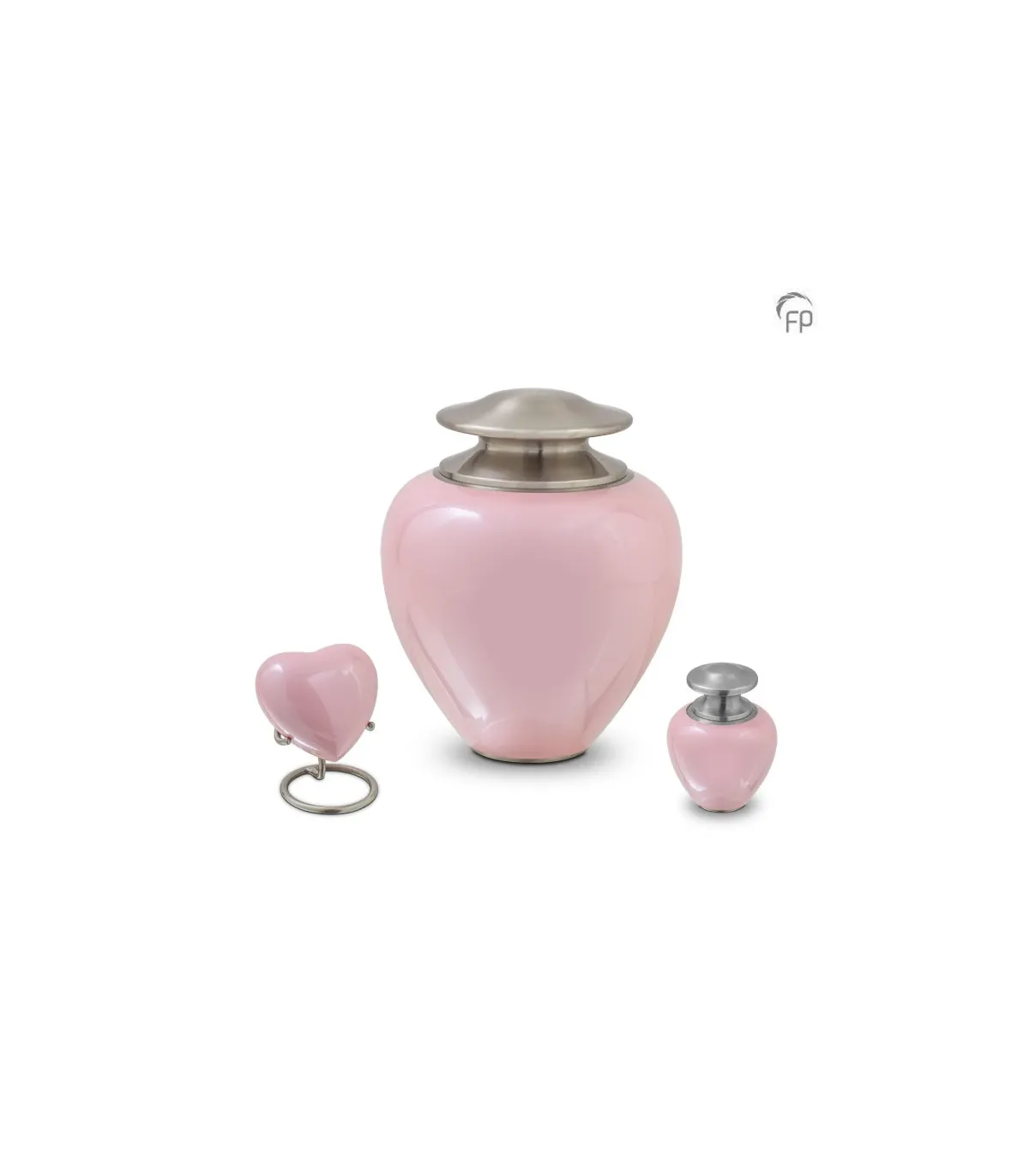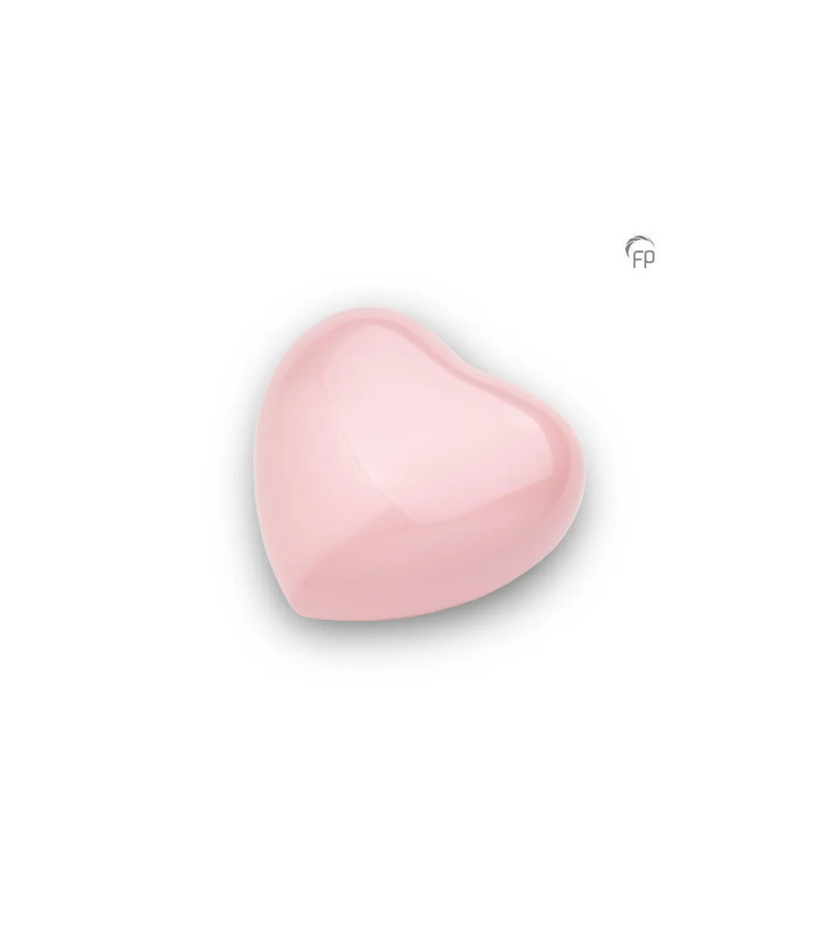 Deze metalen mini hart urn is geheel met de hand vervaardigd uit hoogwaardige materialen, zoals messing en aluminium. De urn is voorzien van een schitterende roze parelmoer finishing.