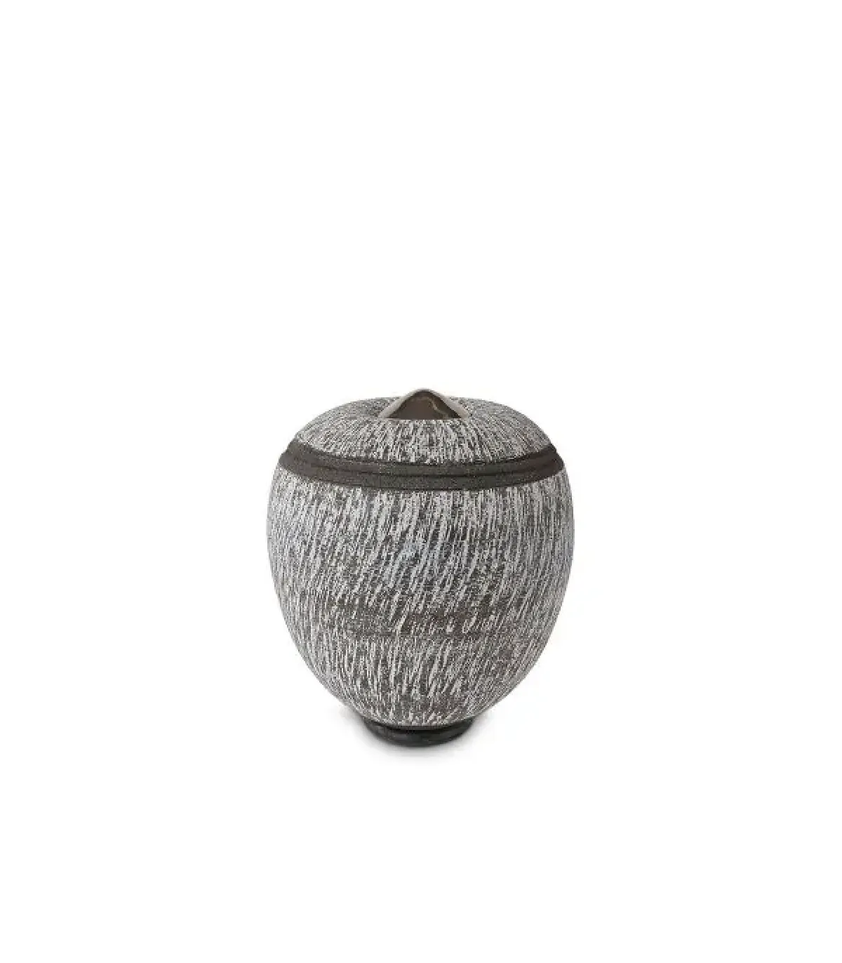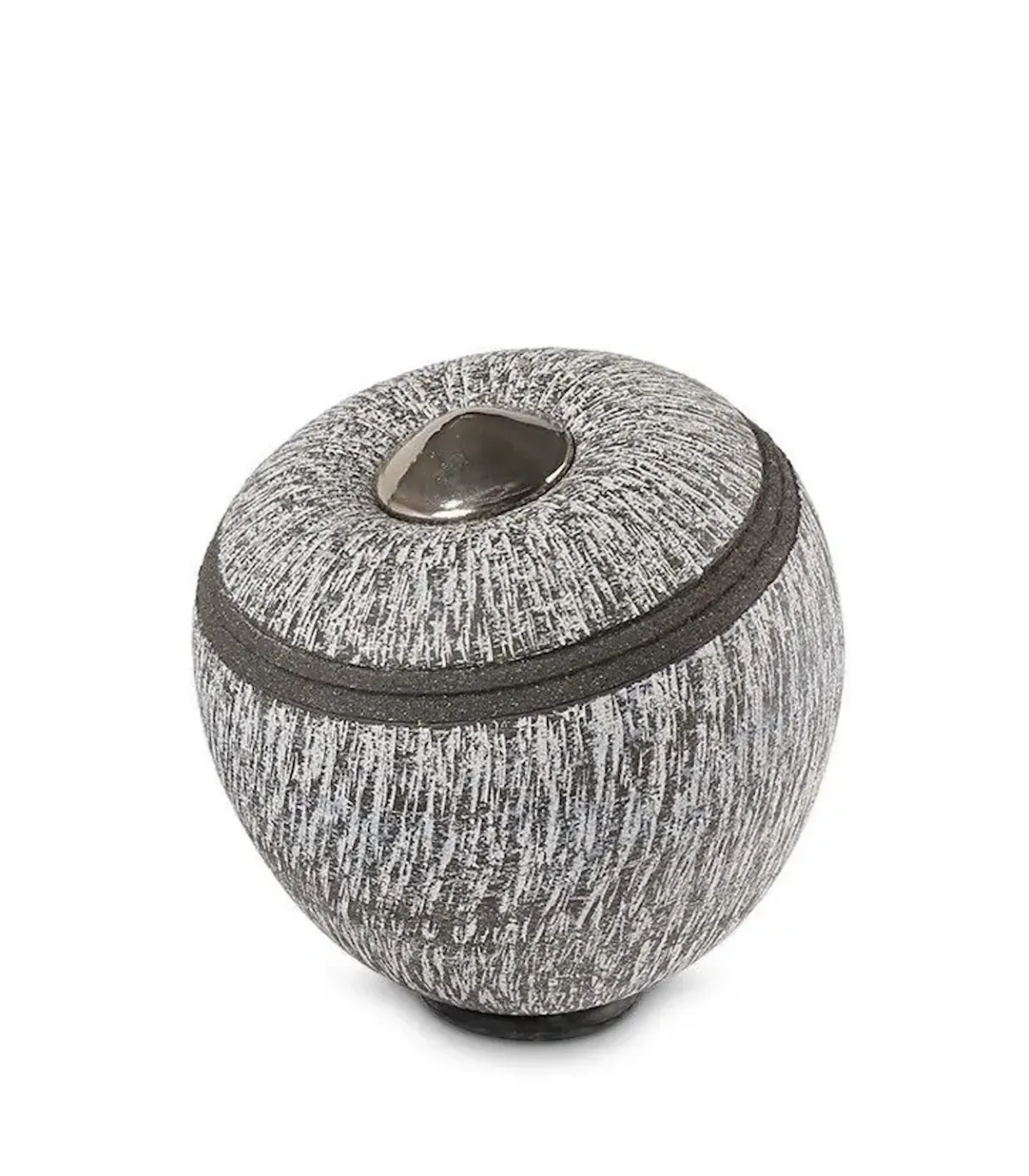 Deze grote handgemaakte keramische urn is vervaardigd uit speciaal geselecteerde ingrediënten die worden gemixt tot een keramische massa. De urn heeft een zwarte basis met daarop een kleurenschakering van warm wit en diepe grijze tinten aangebracht. Om het as-reservoir van de urn af te sluiten wordt een keramische zilveren deksel gebruikt.