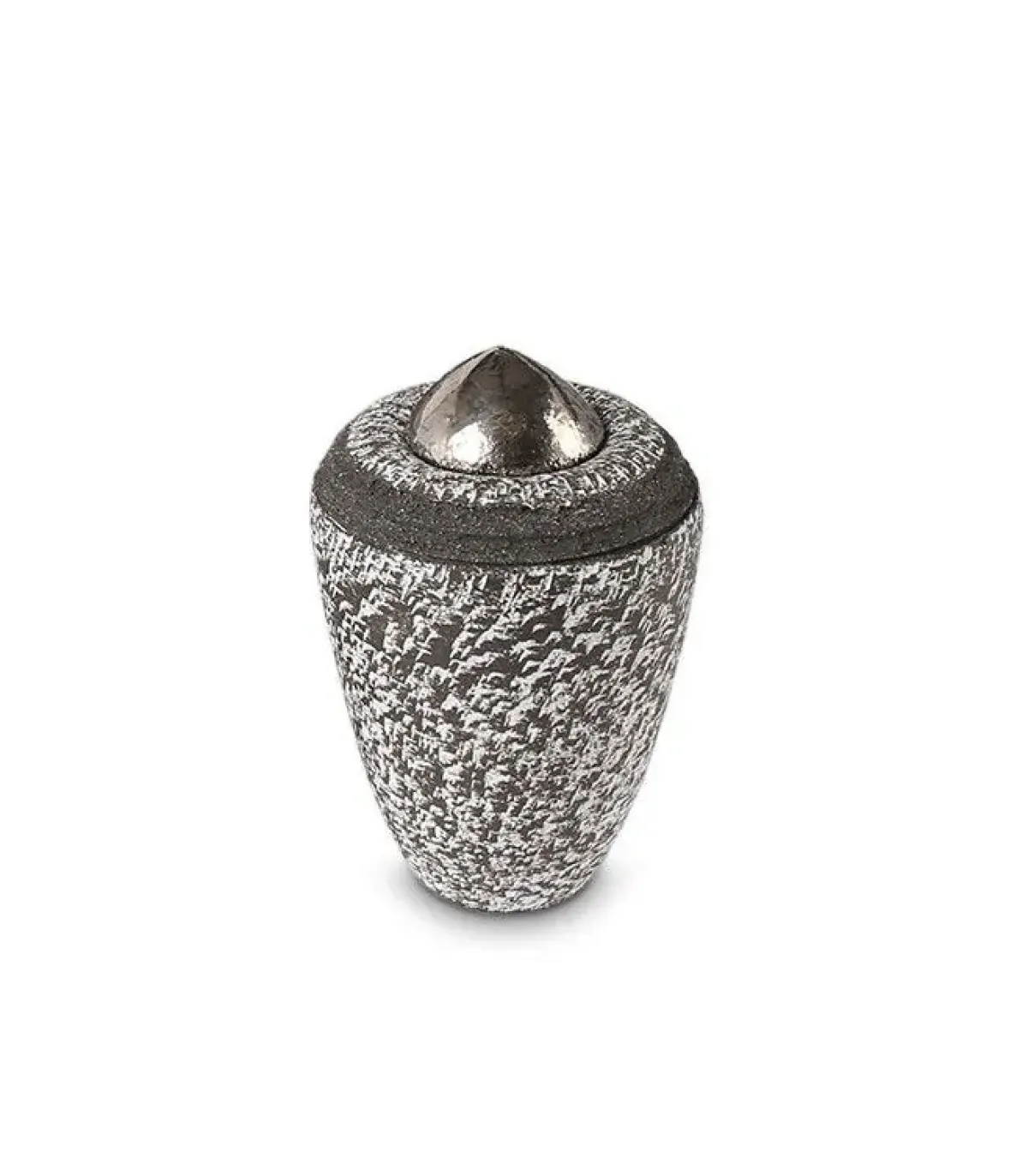 Deze kleine handgemaakte keramische urn is vervaardigd uit speciaal geselecteerde ingrediënten die worden gemixt tot een keramische massa. De urn heeft een zwarte basis met daarop een kleurenschakering van warm wit en diepe grijze tinten aangebracht. Om het as-reservoir van de urn af te sluiten wordt een keramische zilveren deksel gebruikt.
