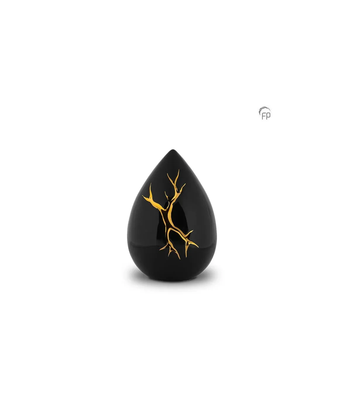 Kintsugi is een Japanse kunst techniek waarbij gebroken keramiek wordt hersteld met lak gemengd met goudkleur, zilverkleur of platinakleur. De filosofie achter deze collectie urnen draait om het benadrukken van scheuren en breuken, in plaats van deze te verbergen. De gouden lijnen accentueren de breuken en houden de herinneringen aan een dierbare levend.