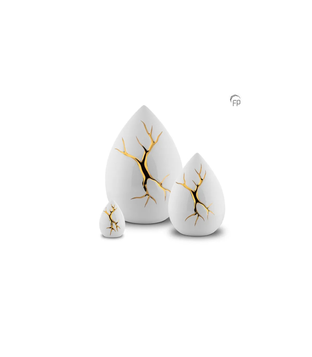 Kintsugi is een Japanse kunst techniek waarbij gebroken keramiek wordt hersteld met lak gemengd met goudkleur, zilverkleur of platinakleur. De filosofie achter deze collectie urnen draait om het benadrukken van scheuren en breuken, in plaats van deze te verbergen. De gouden lijnen accentueren de breuken en houden de herinneringen aan een dierbare levend.