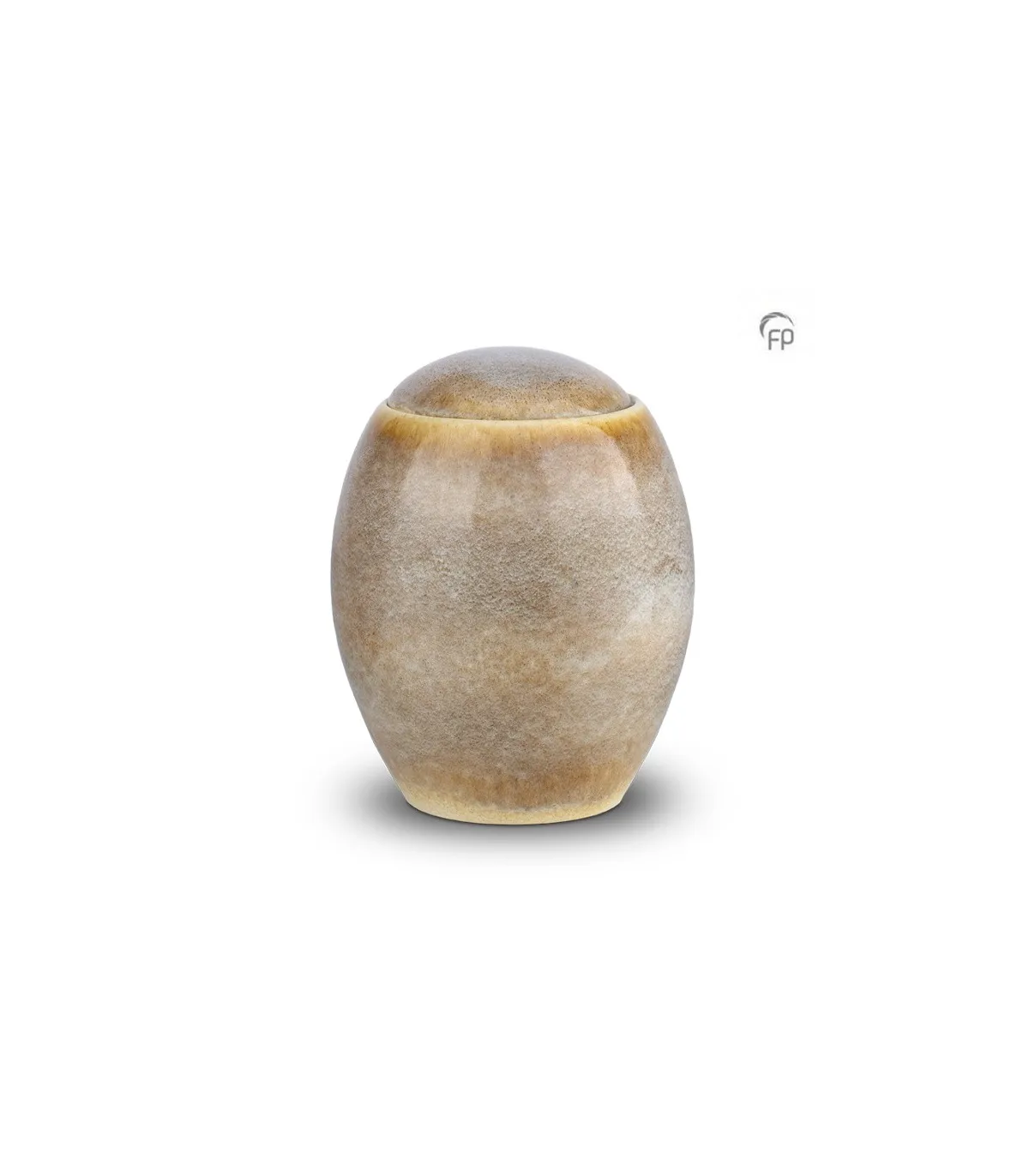 Dit model is een stijlvolle ovale urn met een ‘Sandy White’ kleur: verschillende tinten beige. De urn is zowel aan de binnenkant als aan de buitenkant voorzien van glazuur, zodat deze extra duurzaam en degelijk is.